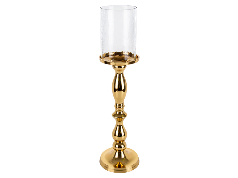 Підсвічник з алюмінію зі скляною колбою висотою 48 см — це стильний аксесуар, який стане окрасою будь-якого інтер’єру. Витончене поєднання золотавого металу та прозорого скла надає виробу сучасного й урочистого вигляду, підкреслюючи його декоративну цінність.