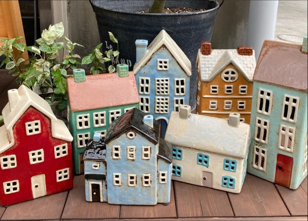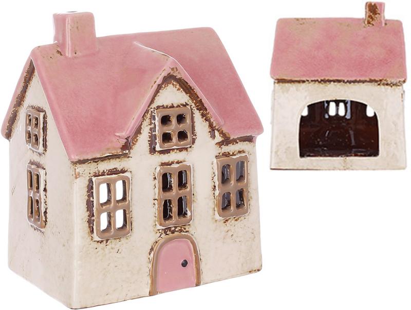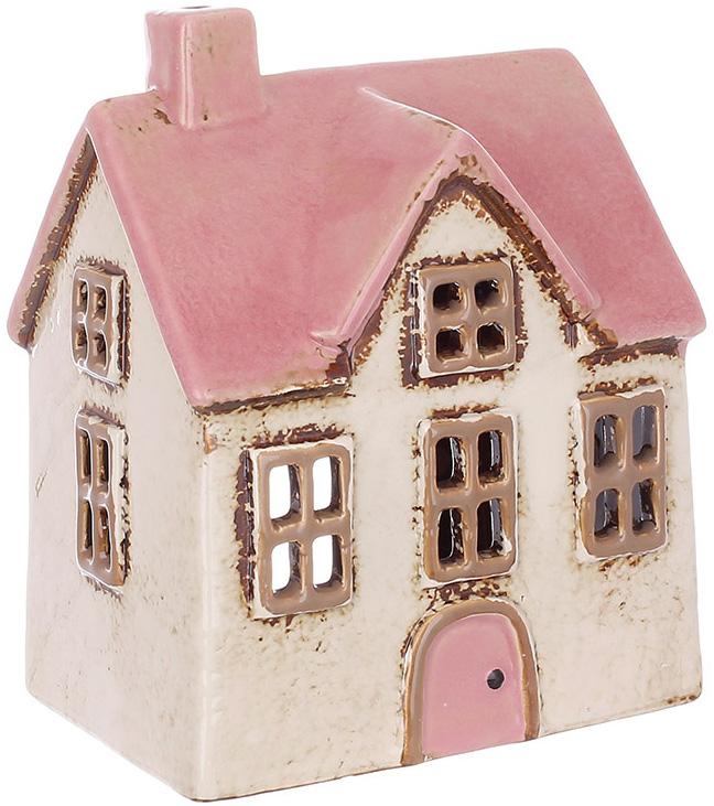 Изделие выполнено в виде маленького домика с ретро-эстетикой. Фасад украшен окнами, дверями и детализированной крышей в пастельных розовато-бежевых тонах с легким эффектом старения.