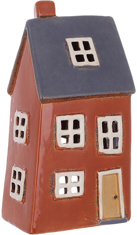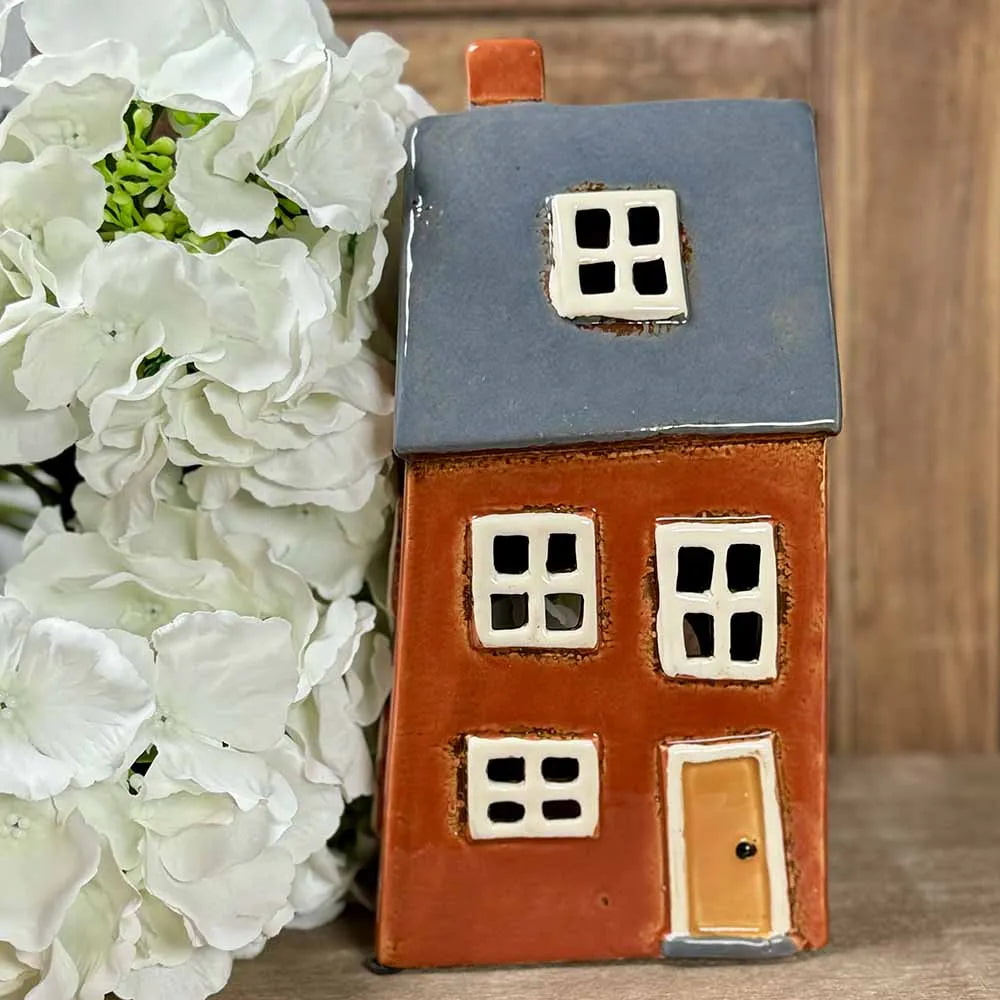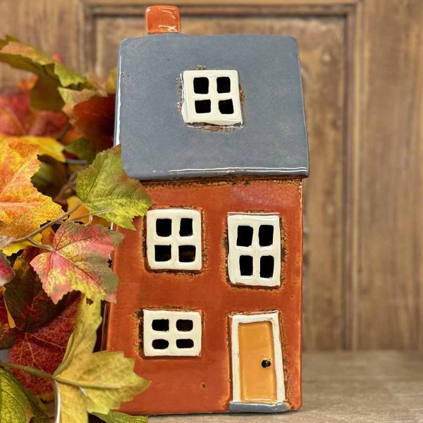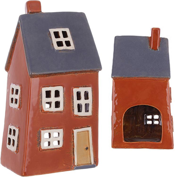 Изделие выполнено в виде маленького домика с ретро-эстетикой. Фасад украшен окнами, дверями и детализированной крышей в терракотовых тонах с легким эффектом старения.