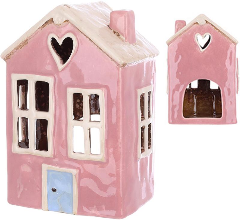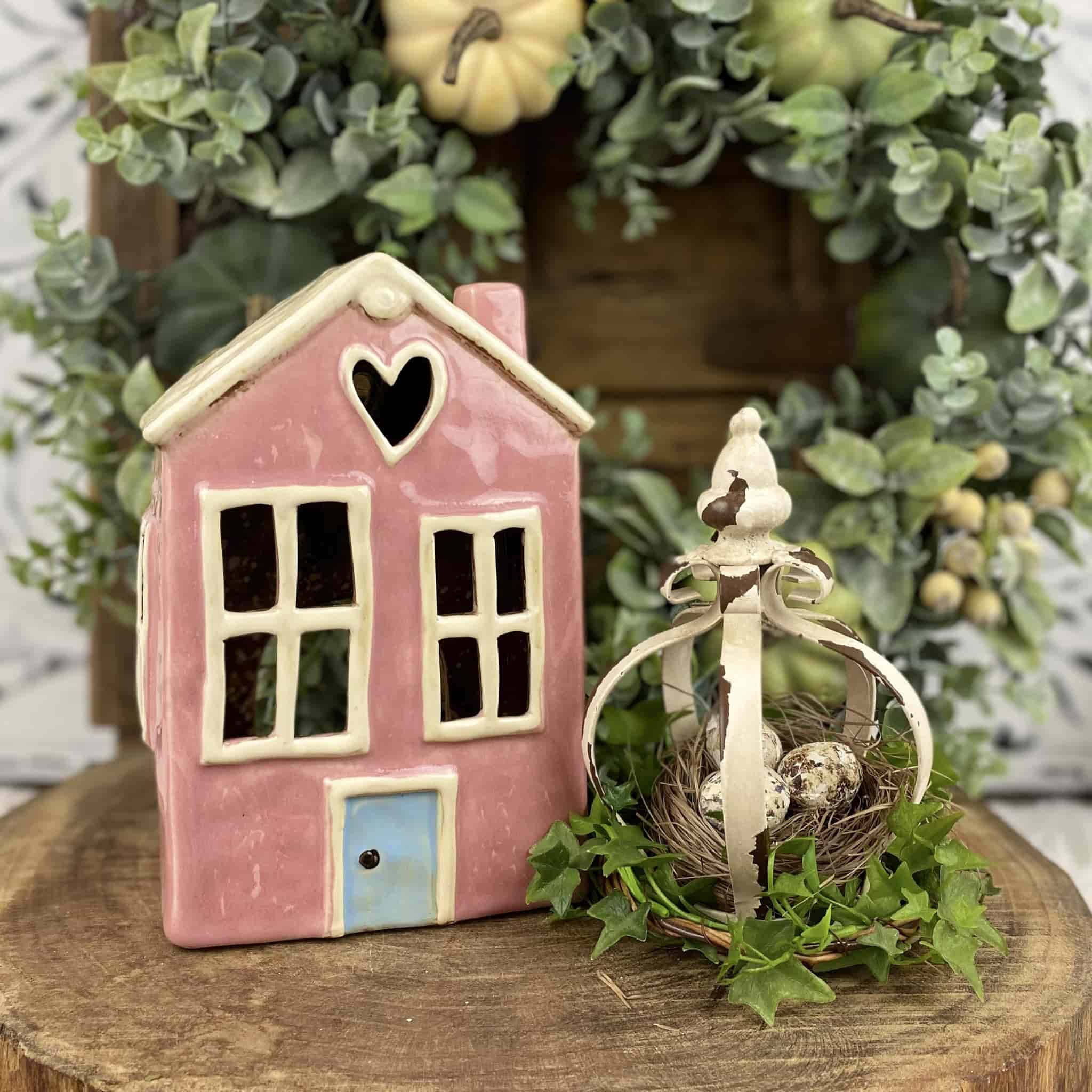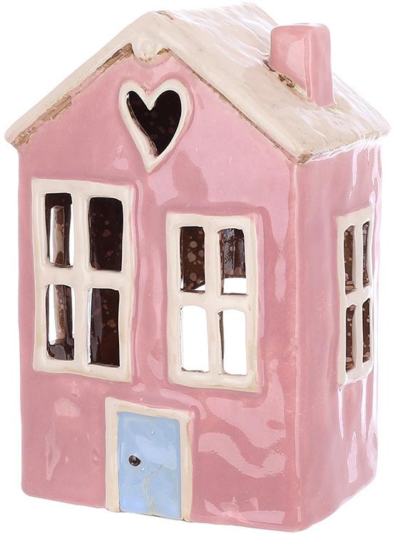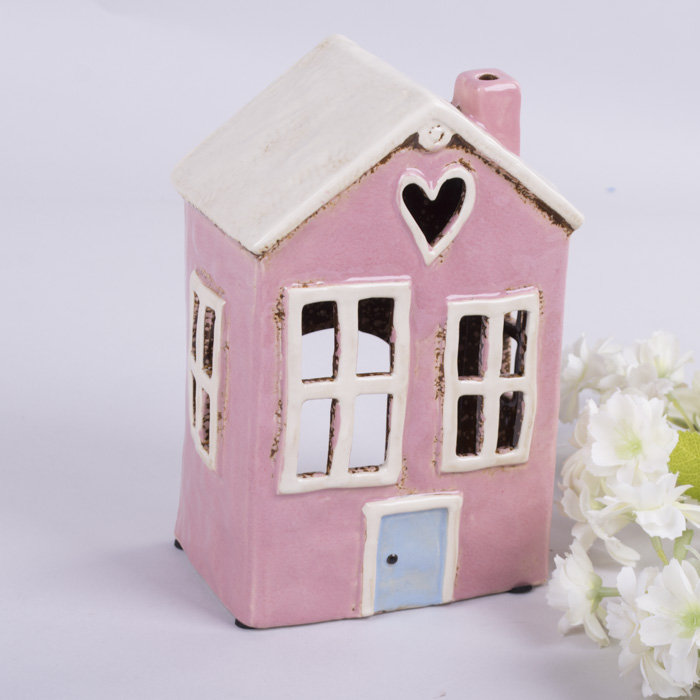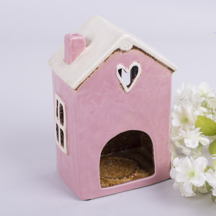 Изделие выполнено в виде маленького домика с ретро-эстетикой. Фасад украшен окнами, дверями и детализированной крышей в розовых тонах с легким старением.