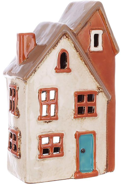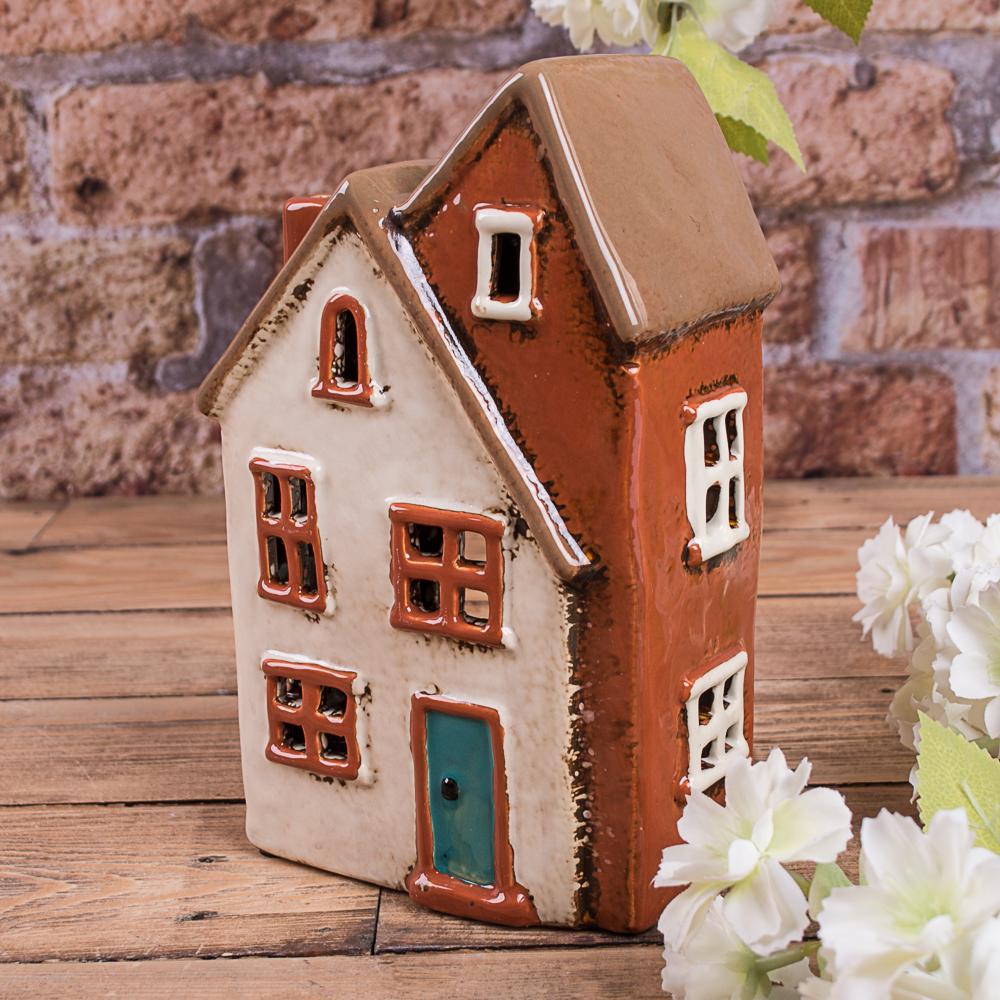 Изделие выполнено в виде маленького домика с ретро-эстетикой. Фасад украшен окнами, дверями и детализированной крышей в пастельных розовато-бежевых тонах с легким эффектом старения.