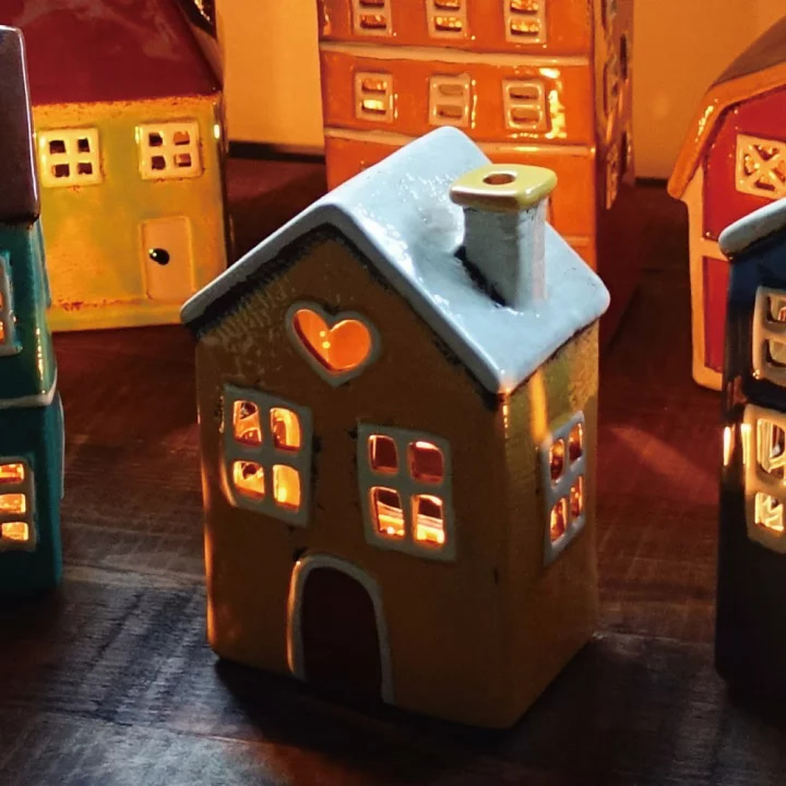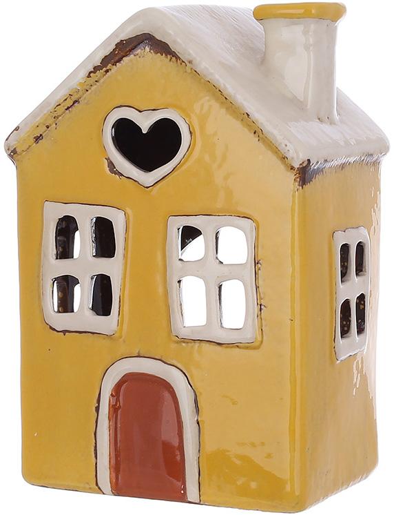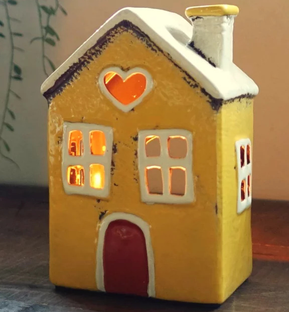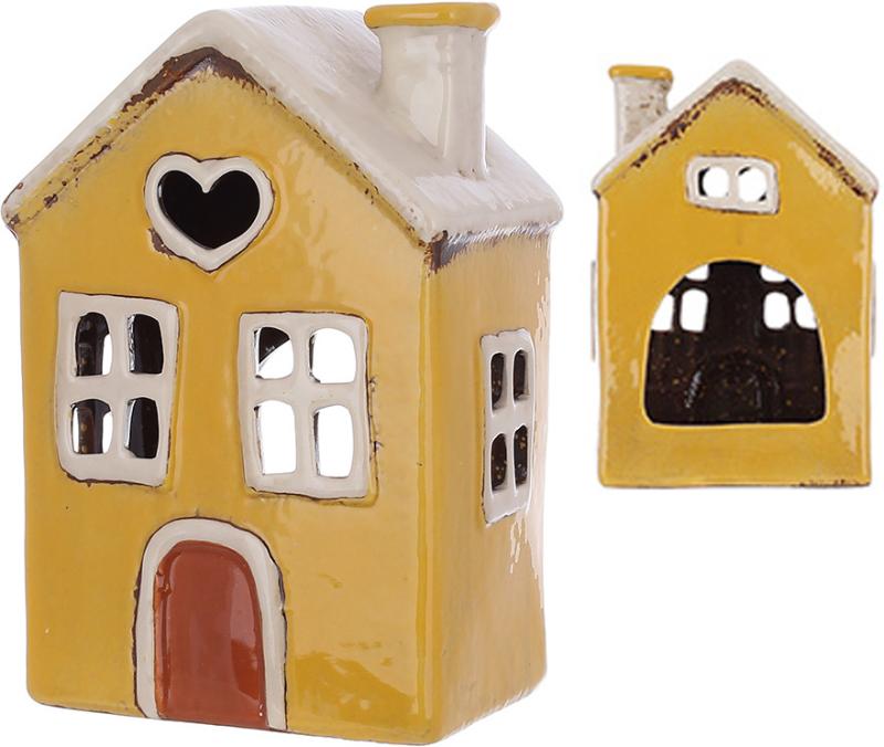 Виріб виконаний у вигляді маленького будиночка з ретро-естетикою. Фасад прикрашений вікнами, дверима та деталізованим дахом у жовтих тонах із легким ефектом старіння.