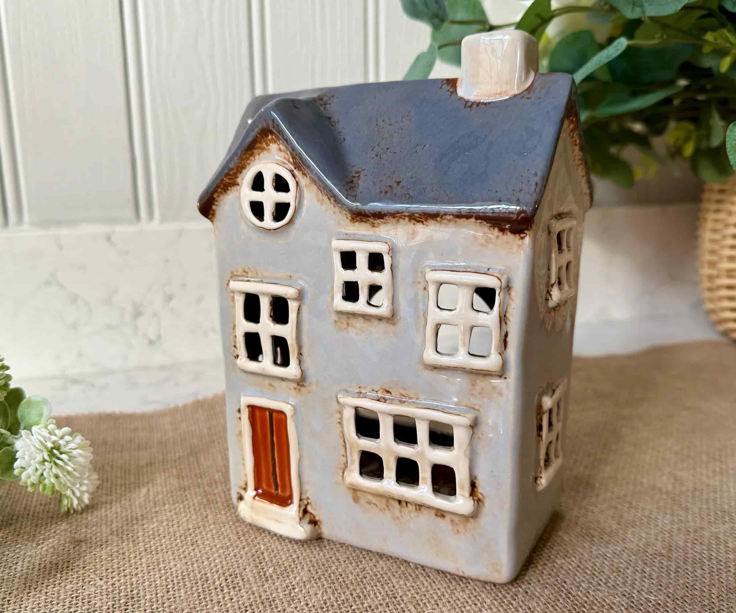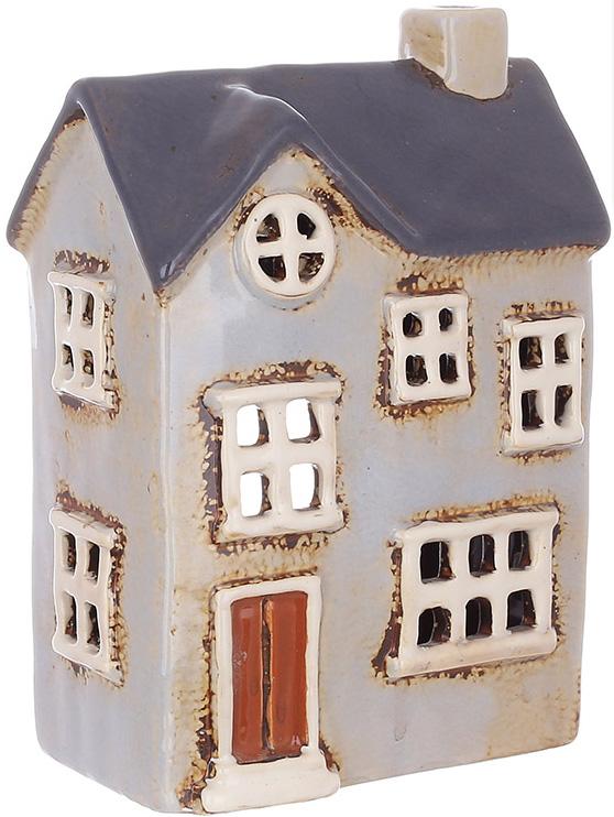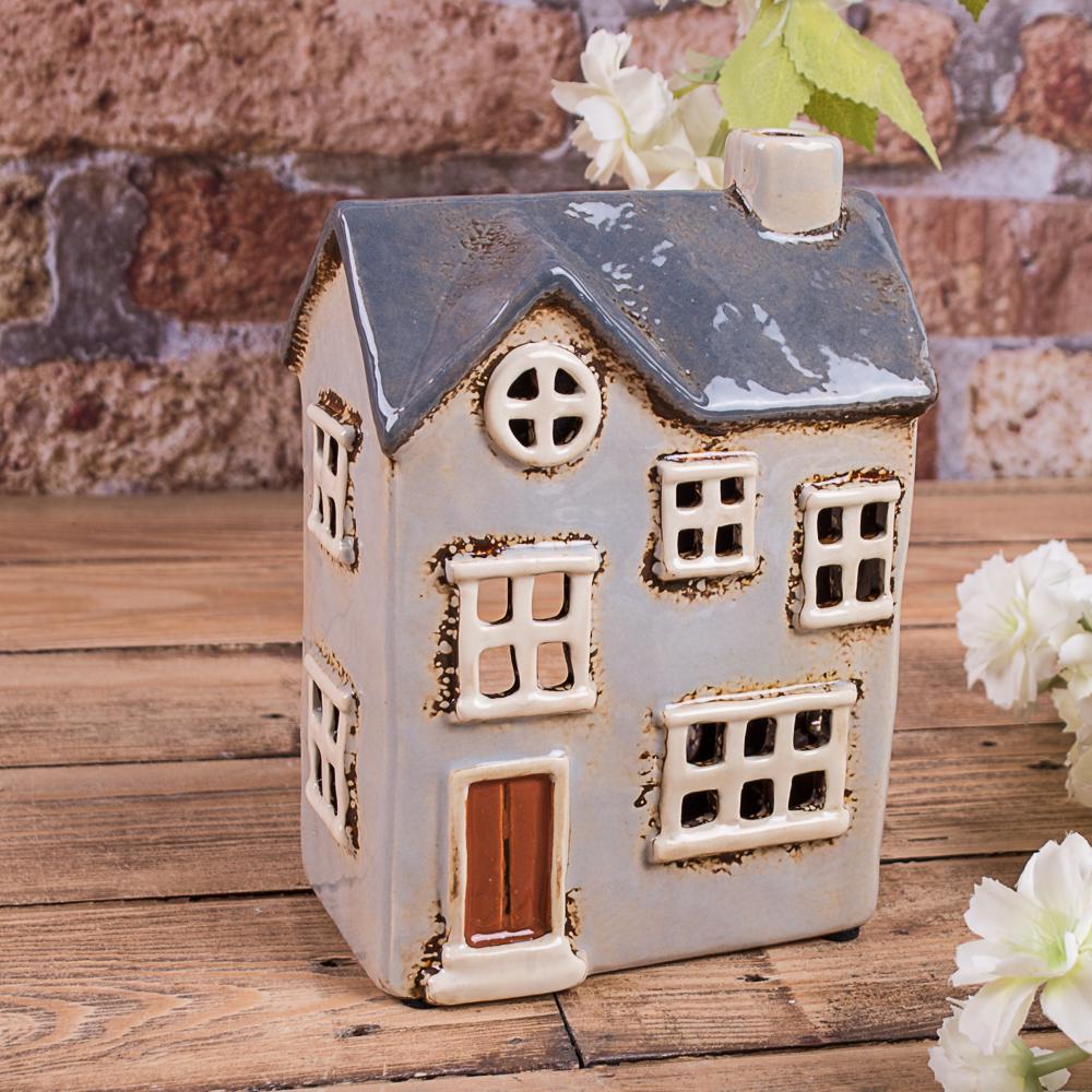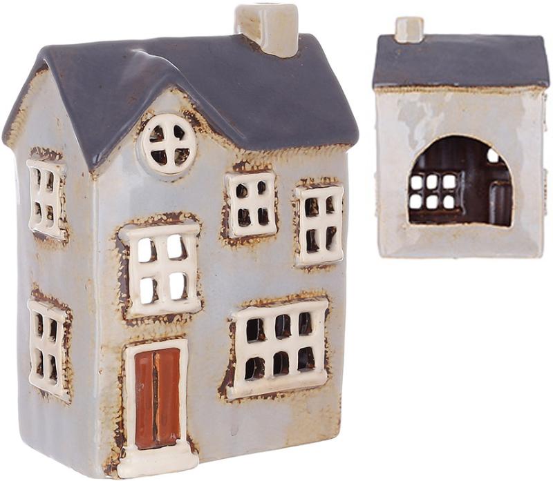 Виріб виконаний у вигляді маленького будиночка з ретро-естетикою. Фасад прикрашений вікнами, дверима та деталізованим дахом у сірих тонах із легким ефектом старіння.