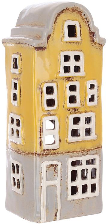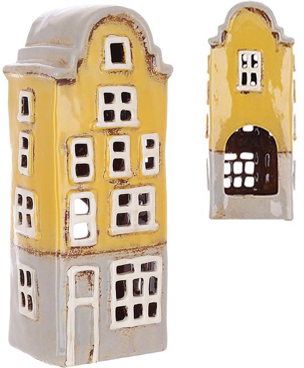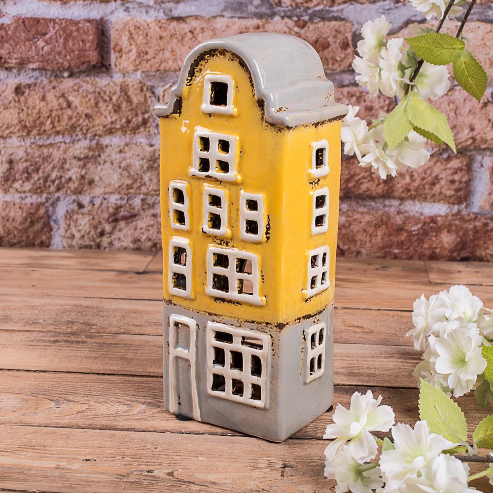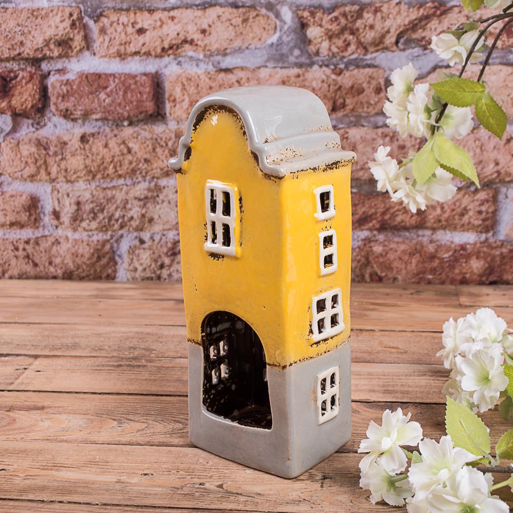 Изделие выполнено в виде маленького домика с ретро-эстетикой. Фасад украшен окнами, дверью и детализированной крышей в желтых тонах с легким старением.