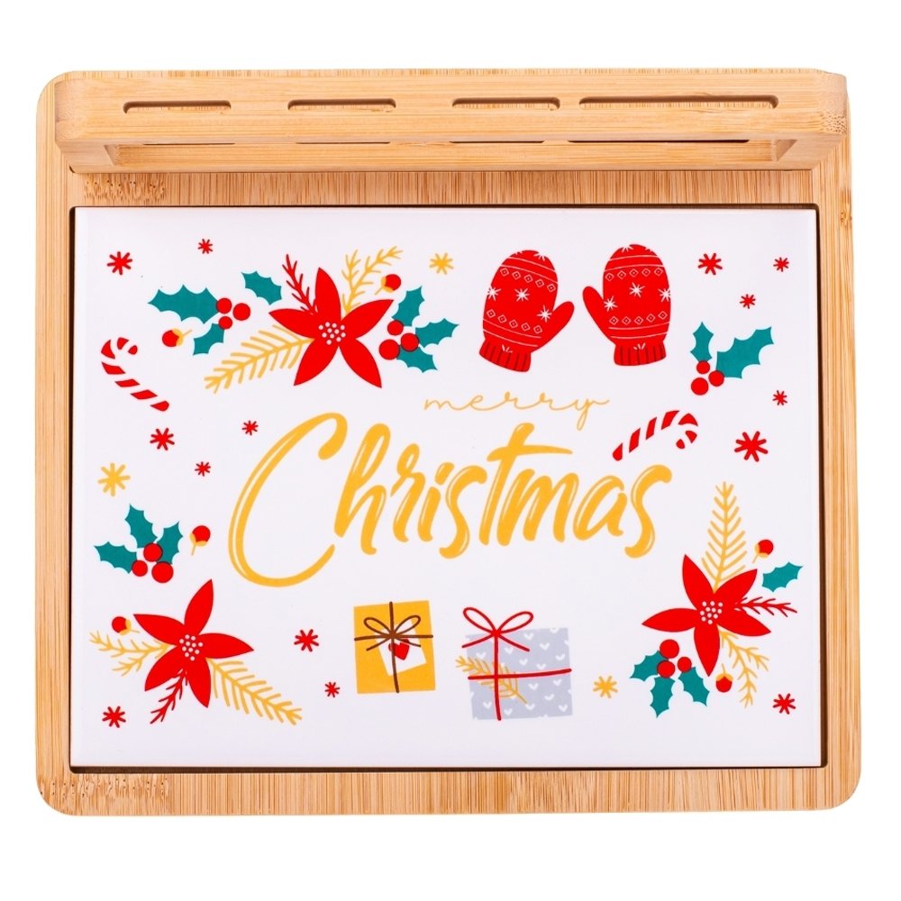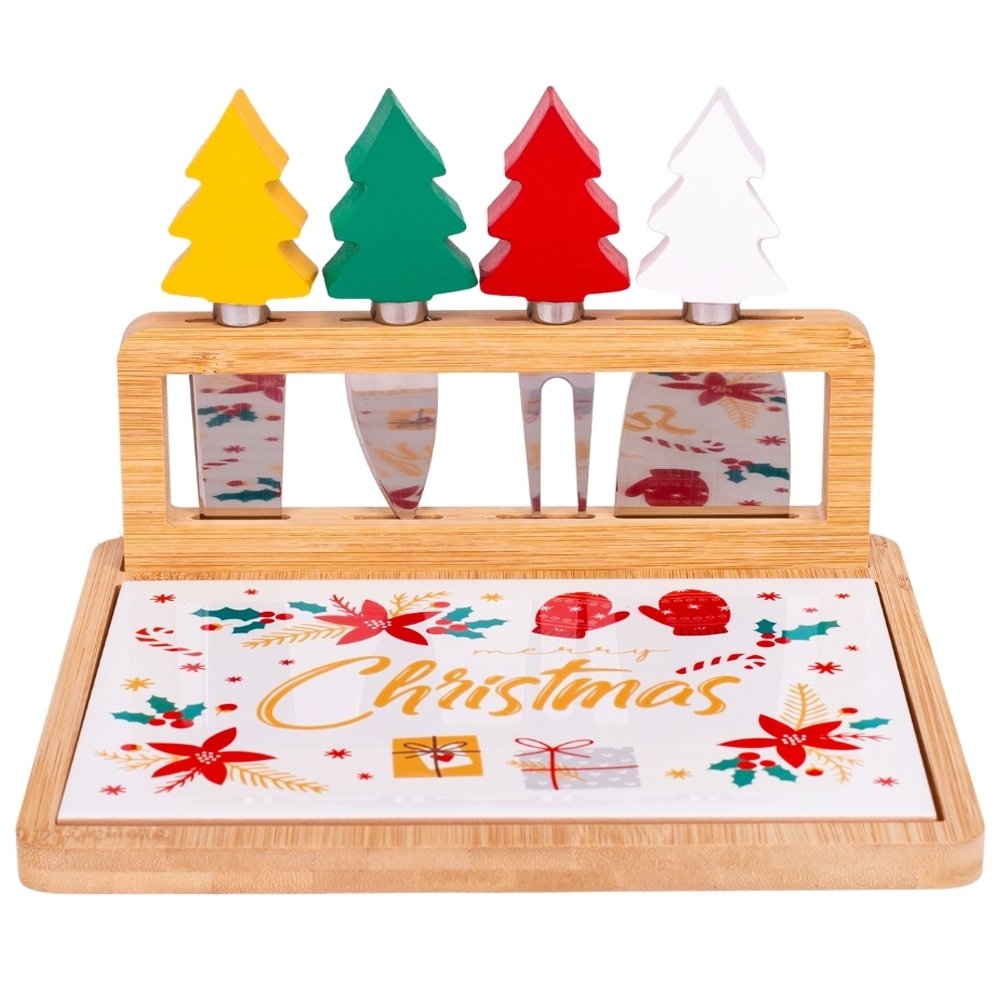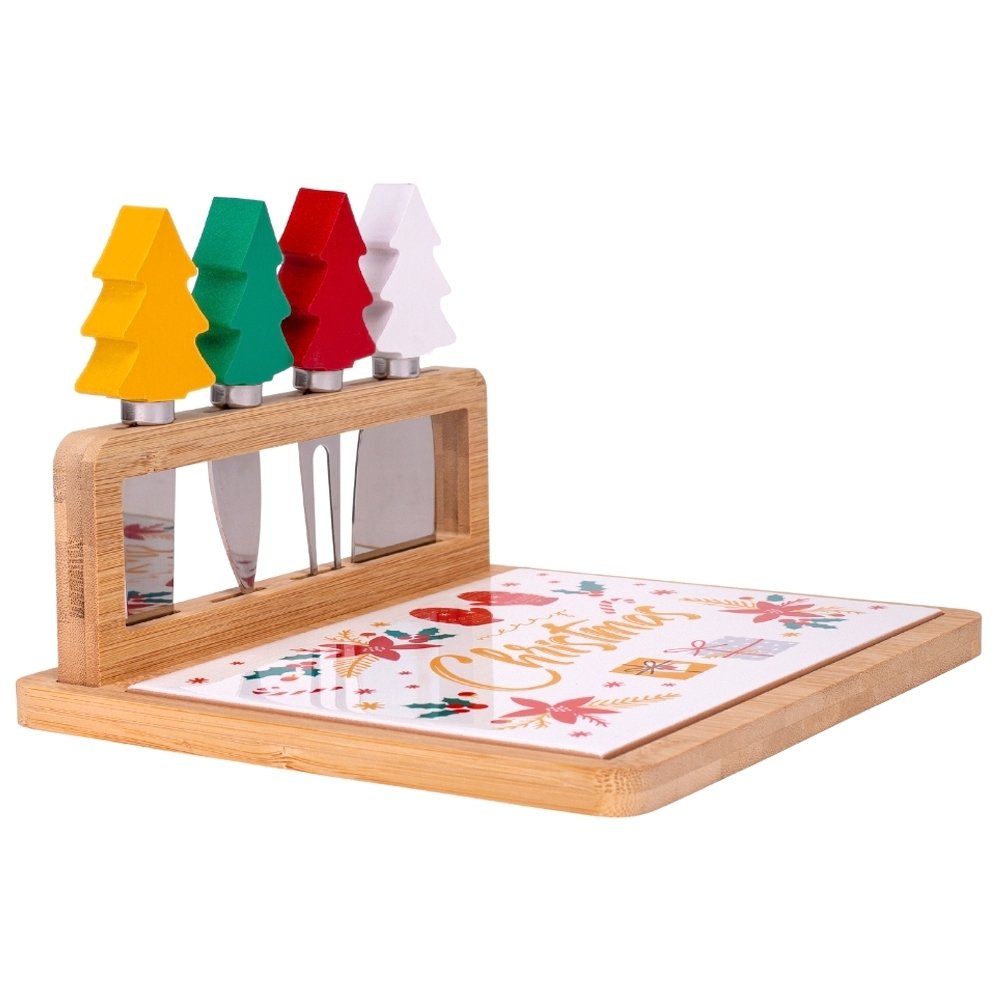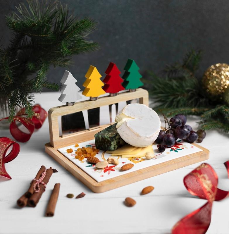 Сырная доска Bamboo Joy – это настоящий праздничный акцент на вашем столе! Компактная и стильная, она сочетает теплую текстуру бамбука и нарядный керамический декор с рождественским рисунком, создавая атмосферу уюта. Доска оборудована держателем для ножей и тремя удобными ножами с разноцветными ручками в форме елочек, которые не только функциональны, но и служат украшением сервировки.