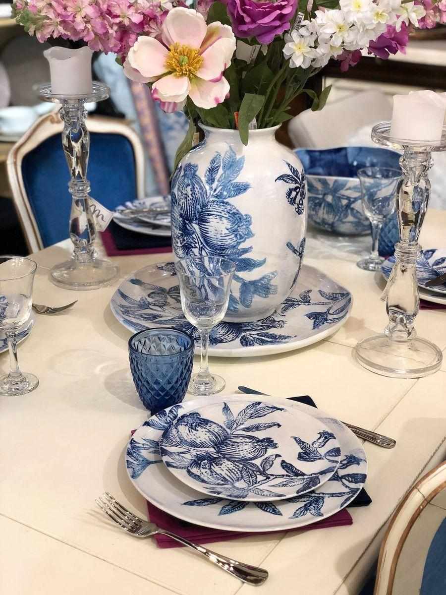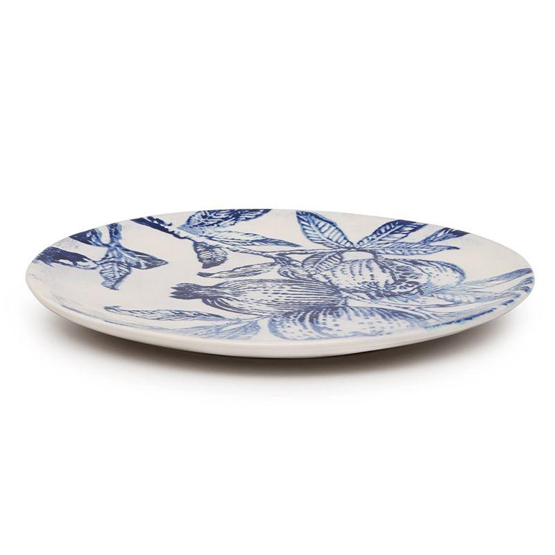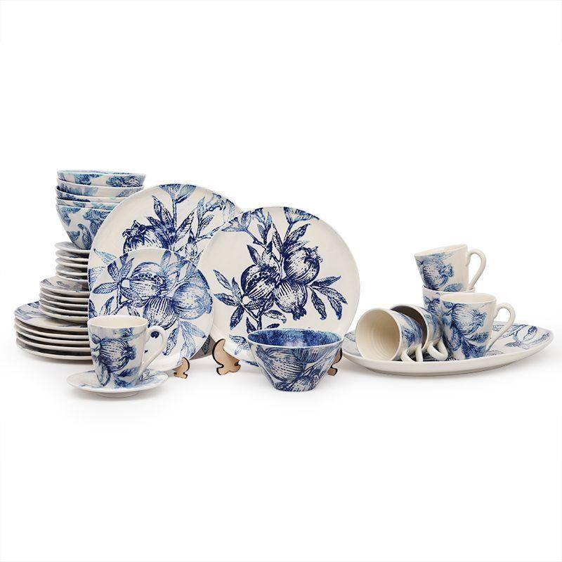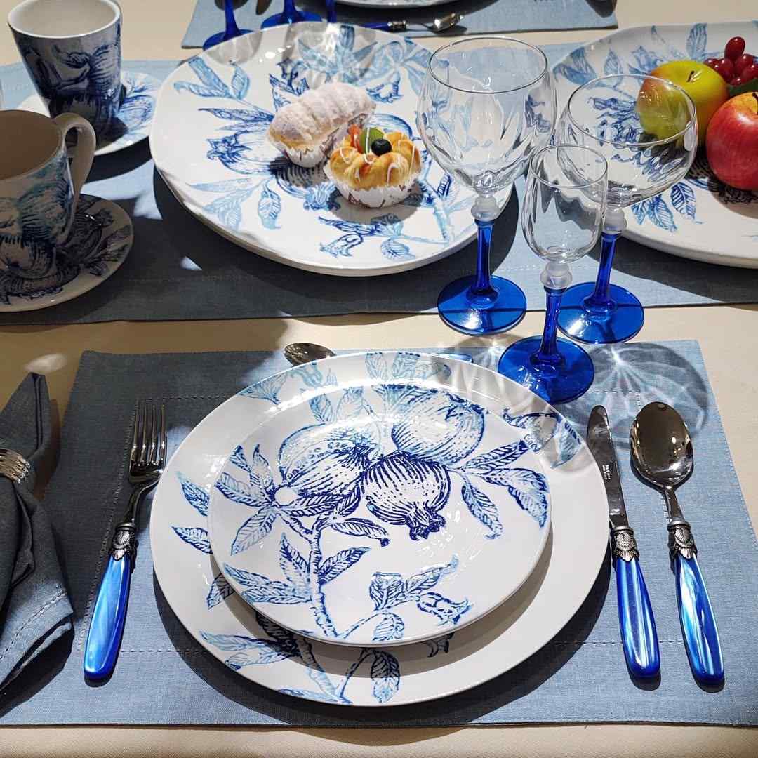 Пышный гранатовый куст в синих вечерних сумерках – концепт, который искусно воплотили итальянские мастера. Коллекция белоснежной глянцевой керамики ручной работы украшена натюрмортом в прохладных голубых и синих оттенках. На рисунке с характерной акварельной размытостью изображены ветки граната с плодами и цветами.