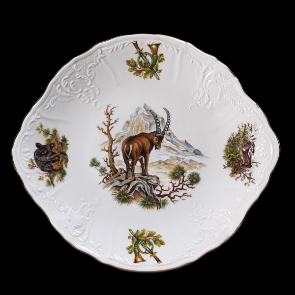 Фарфорове блюдо Bernadotte діаметром 27 см — це не просто посуд, а справжня прикраса святкового столу. Виготовлене з високоякісного чеського фарфору, воно вражає витонченістю форми, рельєфним краєм і делікатною золотою облямівкою. У центрі композиції — гірський козел на тлі скель, оточений сценами з мисливськими мотивами, які створюють враження спокою і гармонії з природою.