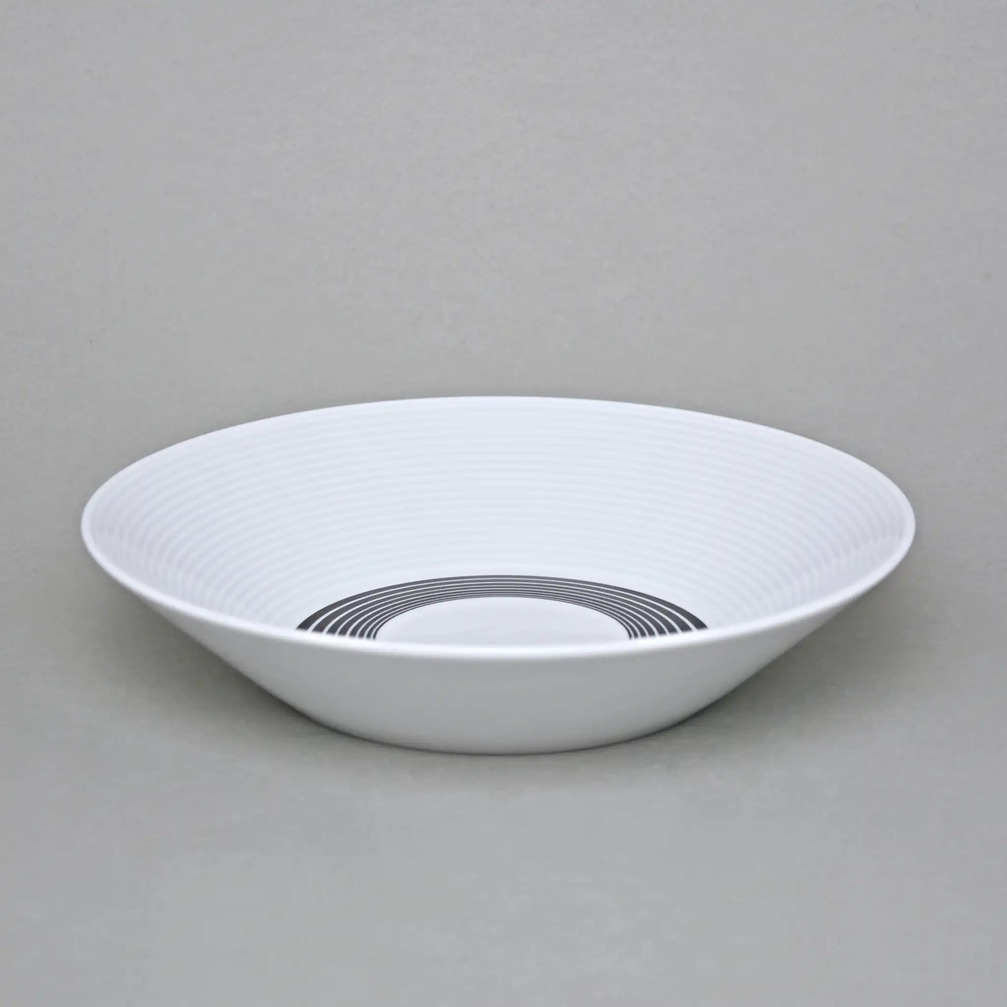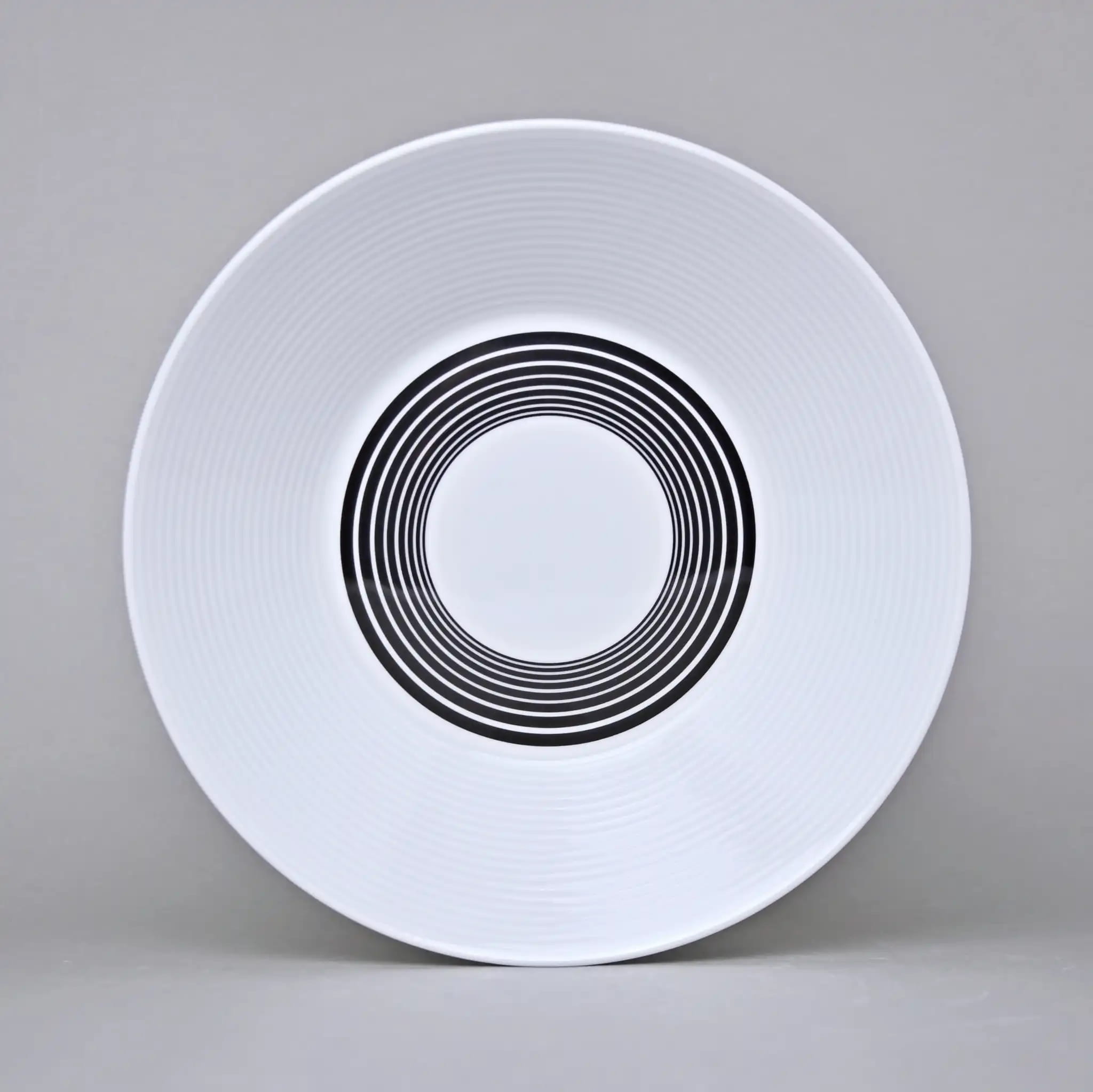 Коллекция фарфоровых тарелок Thun Lea — это настоящая симфония графики и строгости. Чёрно-белый декор с изящными концентрическими линиями превращает каждое изделие в эстетический акцент на столе. Эти тарелки идеально сочетаются между собой, образуя завершённый, гармоничный сервиз в современном стиле.