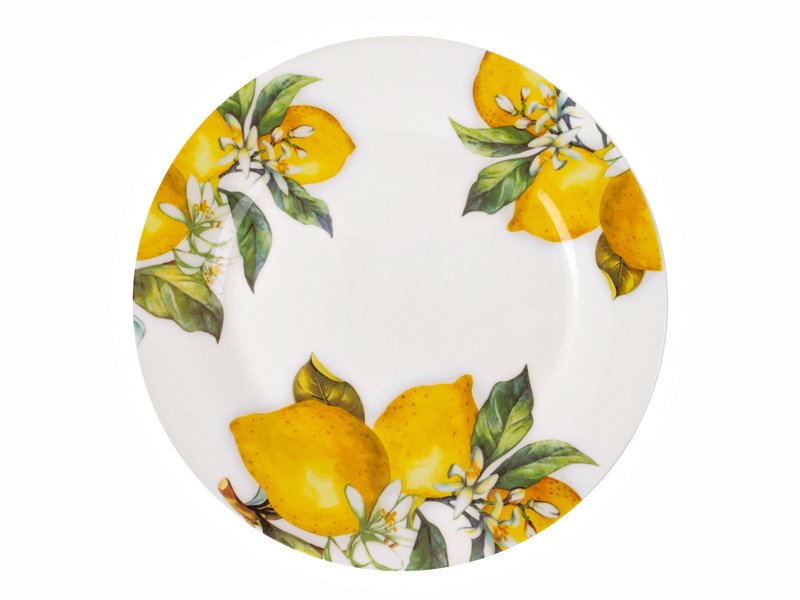 Тарелка фарфоровая Lemon 24,5 см – это роскошный элемент сервировки, который моментально привлекает внимание. Сочные лимоны и свежая зелень на белоснежном фоне создают солнечное настроение и дарят ощущение средиземноморского лета прямо на вашем столе.