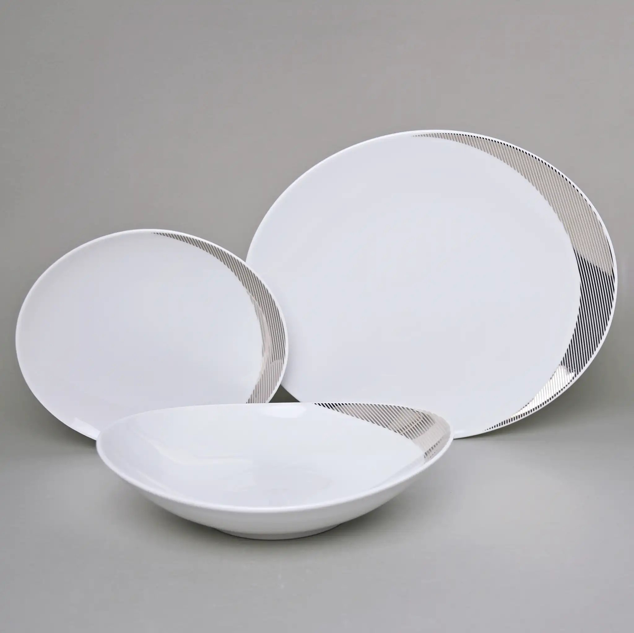 Тарелки коллекции Thun Loos — это ода современному стилю в самом изысканном прочтении. Белоснежный фарфор, графичный платиновый декор и совершенная геометрия делают их не просто частью сервировки, а настоящим арт-объектом на вашем столе. Эстетика минимализма здесь приобретает тёплый, живой характер: никаких излишеств, только свет, линии и вкус.