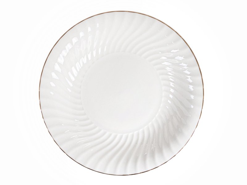 Коллекция фарфоровых тарелок «Меренга» — это воплощение утончённой классики и лёгкой праздничной элегантности. Белоснежный фарфор украшен рельефным узором в виде мягких волнообразных линий, а по краю проходит изящная золотая окантовка, которая придаёт сервировке благородный и изысканный вид. Такие тарелки идеально подойдут как для повседневных обедов, так и для торжественных ужинов с гостями.