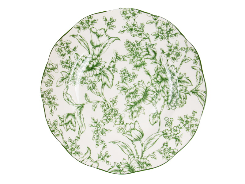 Форма с мягко волнистым краем придаёт изделию изящество и винтажный характер, а зелёная кайма подчёркивает глубину цвета рисунка. Фарфор отличается высокой прочностью, устойчивостью к повседневному использованию и легко переносит мытьё в посудомоечной машине. Это делает тарелку не только красивым, но и практичным выбором.