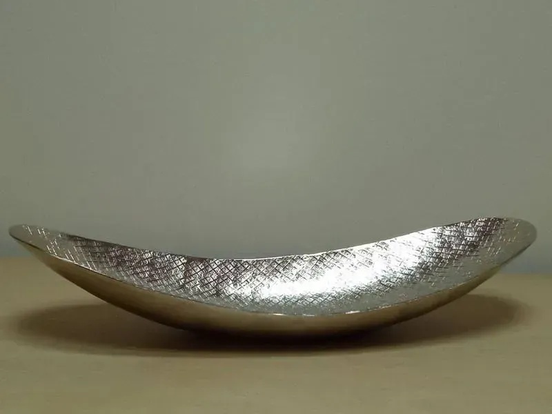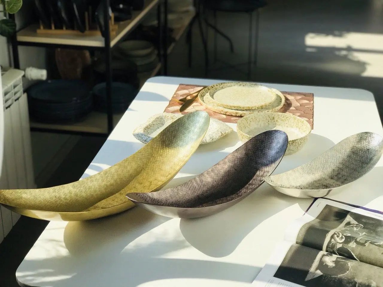 "Shaped Horizons" — это не просто коллекция тарелок. Это воплощение грации, баланса и природной динамики, застывшей в металле. Каждое изделие этой серии — как лёгкий изгиб горизонта, застывший в моменте. Их форма напоминает корпус лодки — изогнутая, воздушная, в то же время основательная и уверенная.