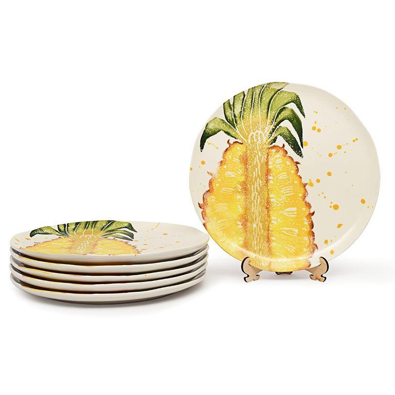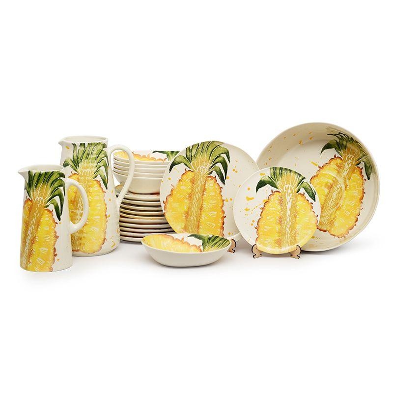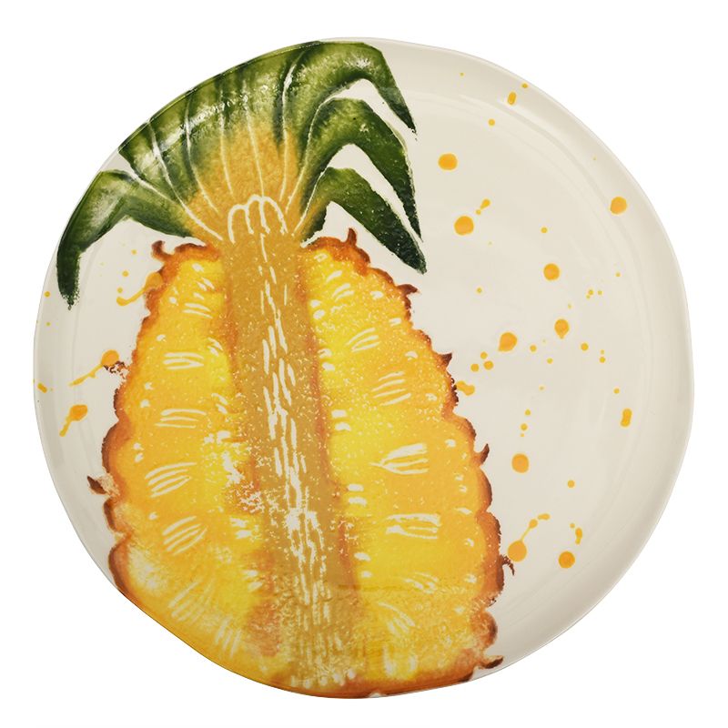 Обеденная тарелка «Фруктовый коктейль» с ананасом от Villa Grazia станет ярким акцентом на вашем столе. Сочный жёлтый оттенок и реалистичный рисунок спелого ананаса создают ощущение летнего настроения и свежести. Белоснежная основа с хаотичными золотистыми брызгами добавляет динамики и делает тарелку эффектной даже без дополнительного декора.
