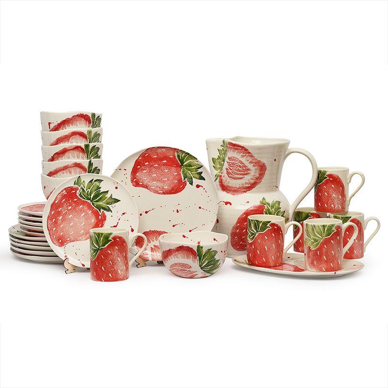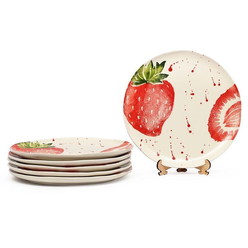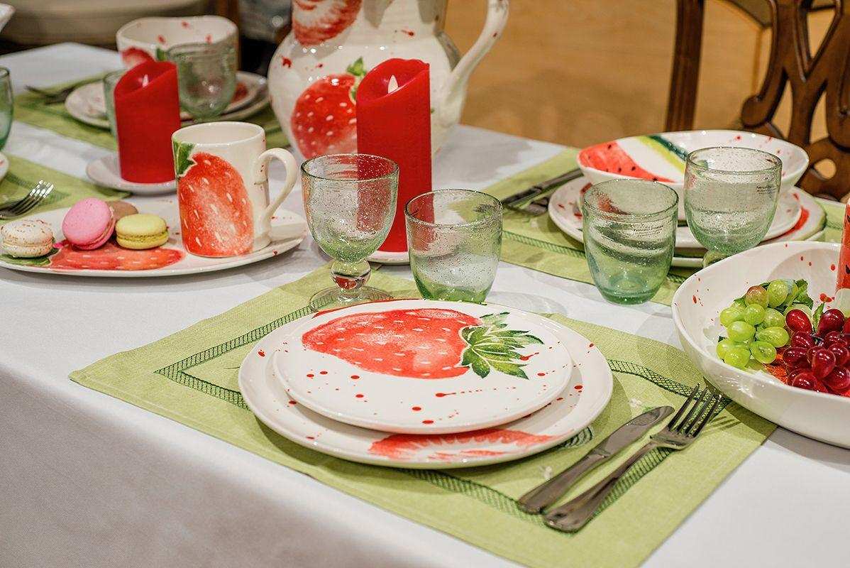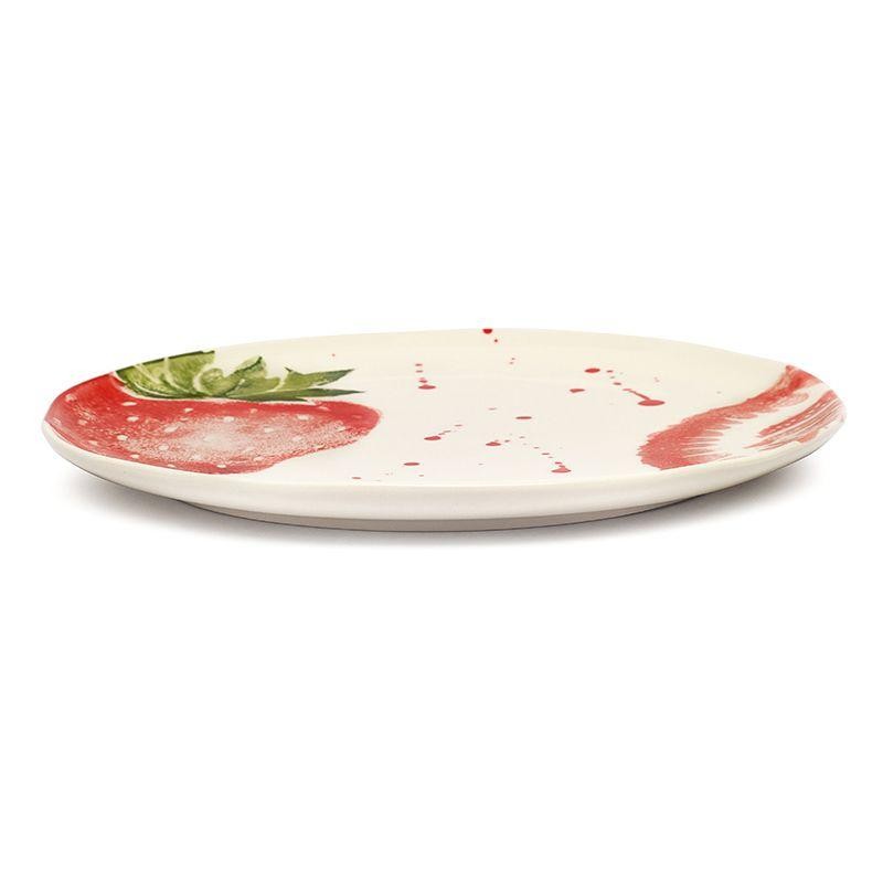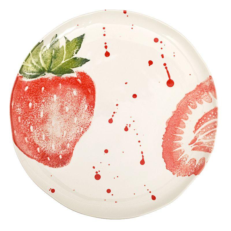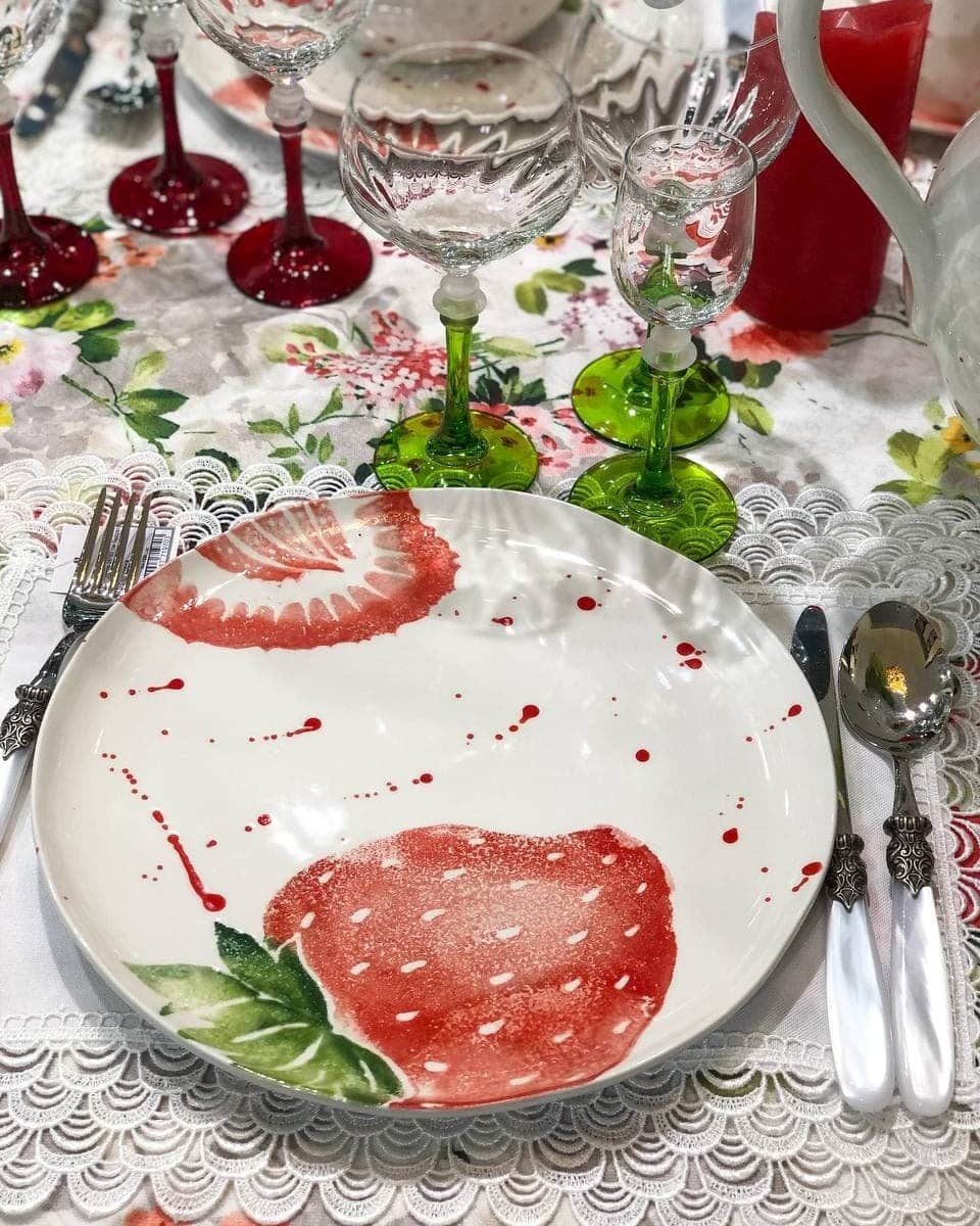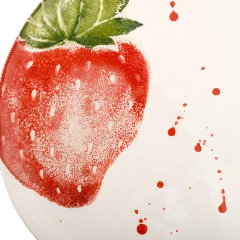 Обеденная тарелка «Фруктовый коктейль» Villa Grazia создаёт атмосферу солнечного настроения и летней свежести. Её поверхность украшена ярким рисунком спелой клубники, выполненным в акварельной технике, с лёгкими художественными брызгами. Белоснежный фон подчёркивает сочность красных и зелёных оттенков, превращая каждую трапезу в праздник вкуса и цвета.