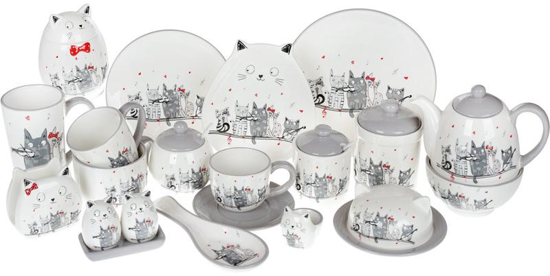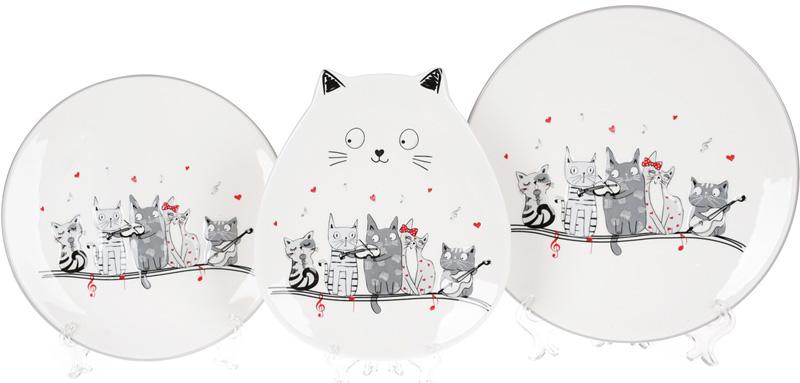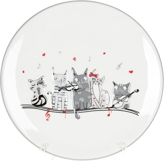 Керамічна тарілка Нічна серенада, діаметр 24см, На білому тлі компанія котів музикантів та кішечка з червоним бантом - об'ємний малюнок, Романтичний декор викликає теплі мрійливі емоції та забезпечує позитивний настрій господині кухні та її гостям