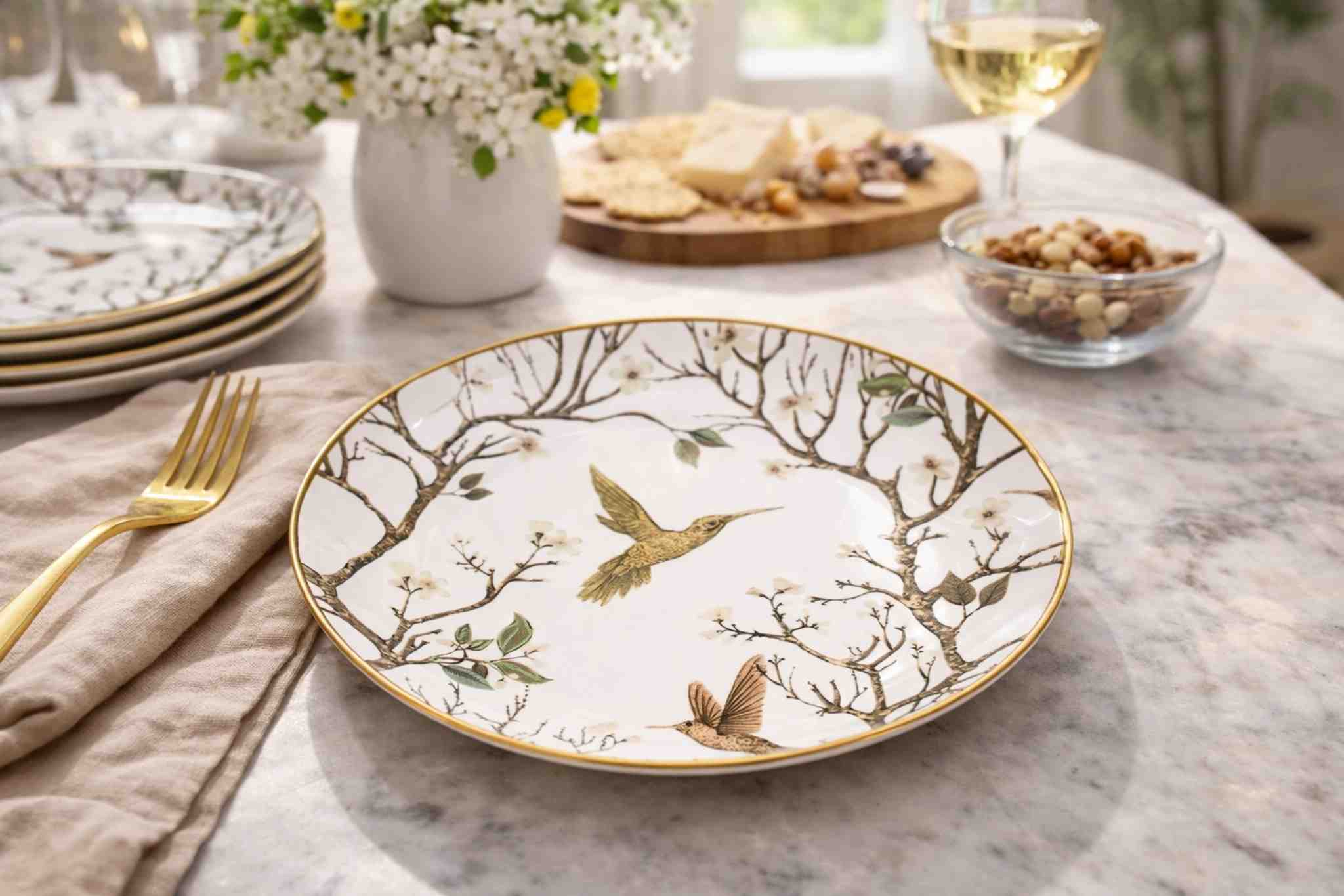 Тарелки из коллекции «Bird» — это изысканное сочетание природной легкости и утончённого дизайна. На светлом фоне разворачивается нежная композиция: тонкие ветви с цветами образуют изящный венок, внутри которого парят миниатюрные птицы. Золотистая окантовка придает тарелке аккуратный, завершённый вид и делает её заметным акцентом на столе без лишней перегруженности.