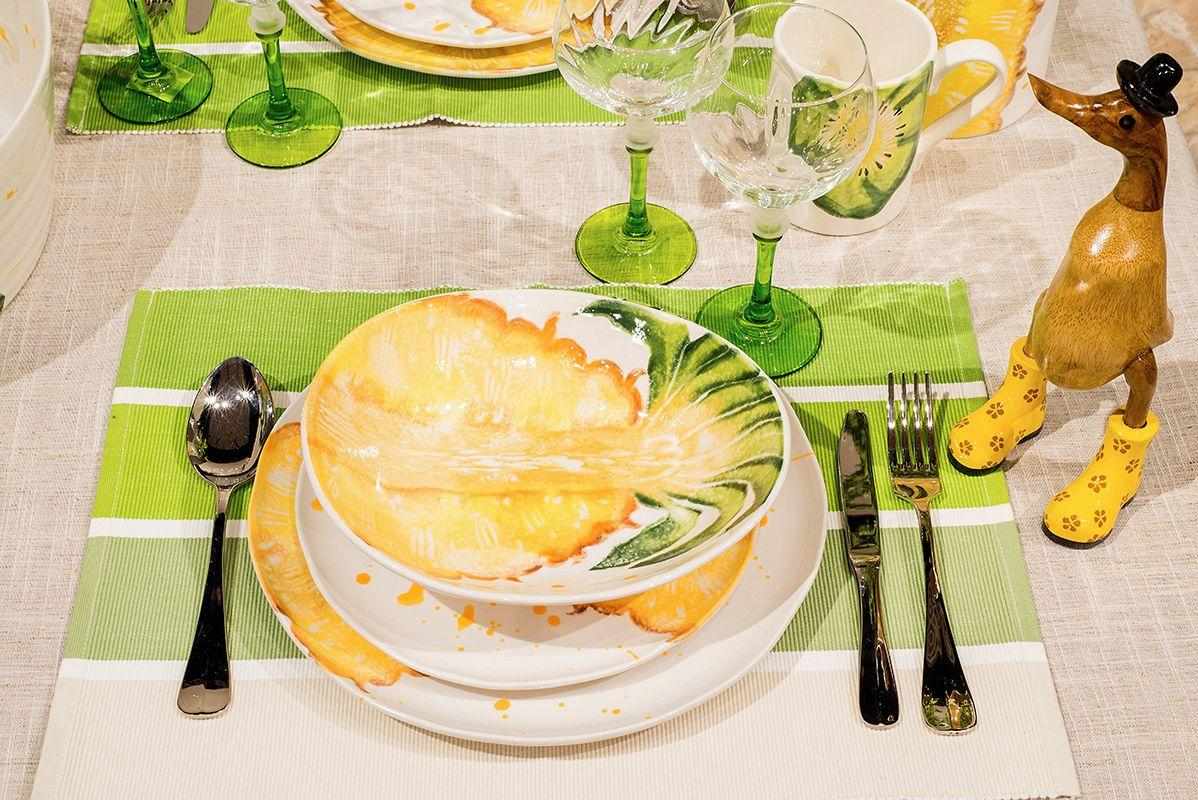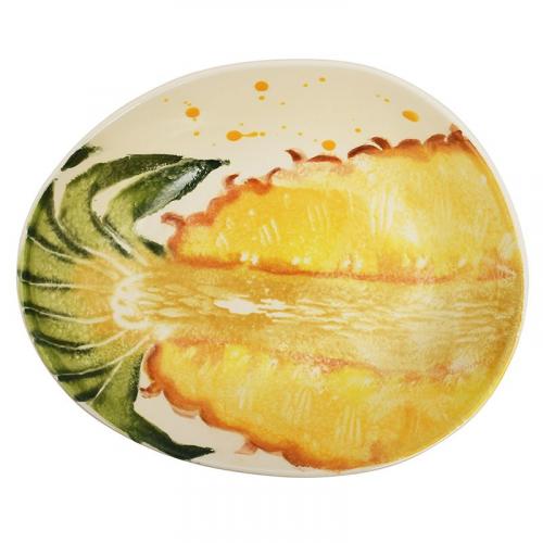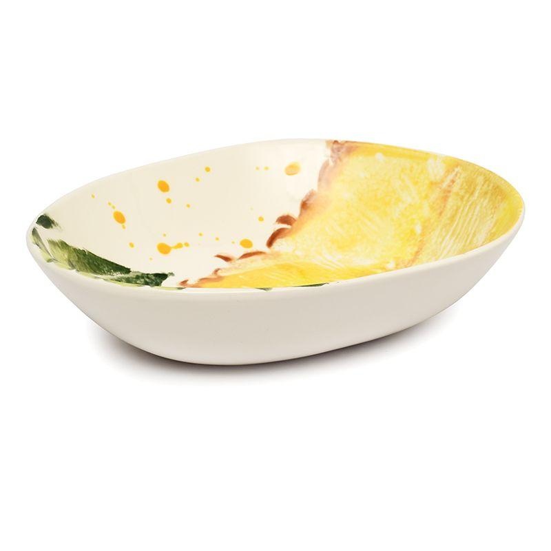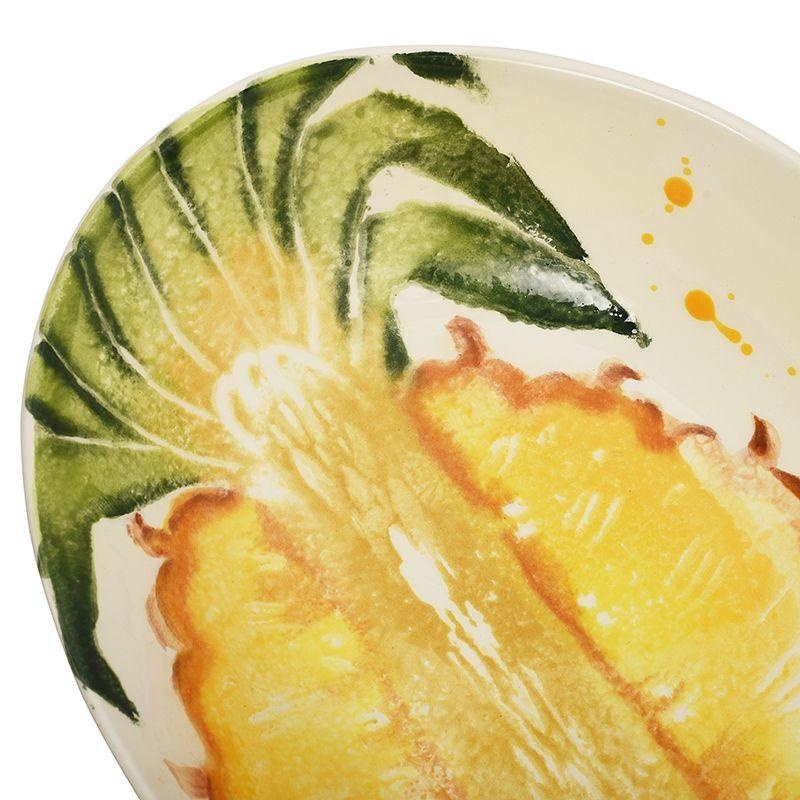 Овальная суповая тарелка «Фруктовый коктейль» Villa Grazia поражает своим сочным и жизнерадостным дизайном. На белоснежной поверхности вручную нанесён яркий рисунок сочного ананаса, выполненный в акварельной технике. Жёлтые и зелёные мазки создают эффект солнечного света, который будто играет на фруктовой кожуре.