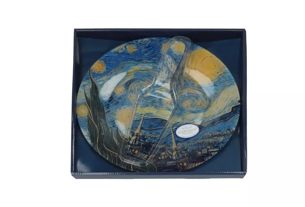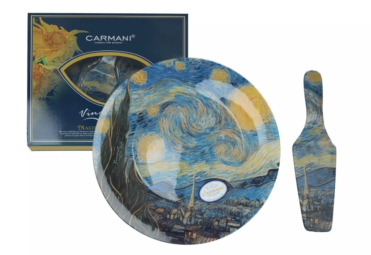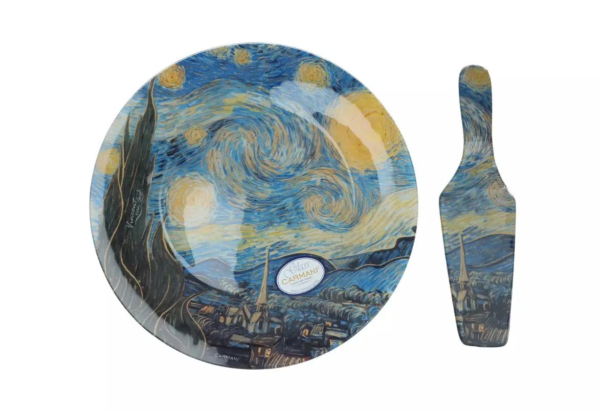 Тарелка-тортовница с лопаткой стеклянная Carmani Ван Гог Звездная Ночь 30 см