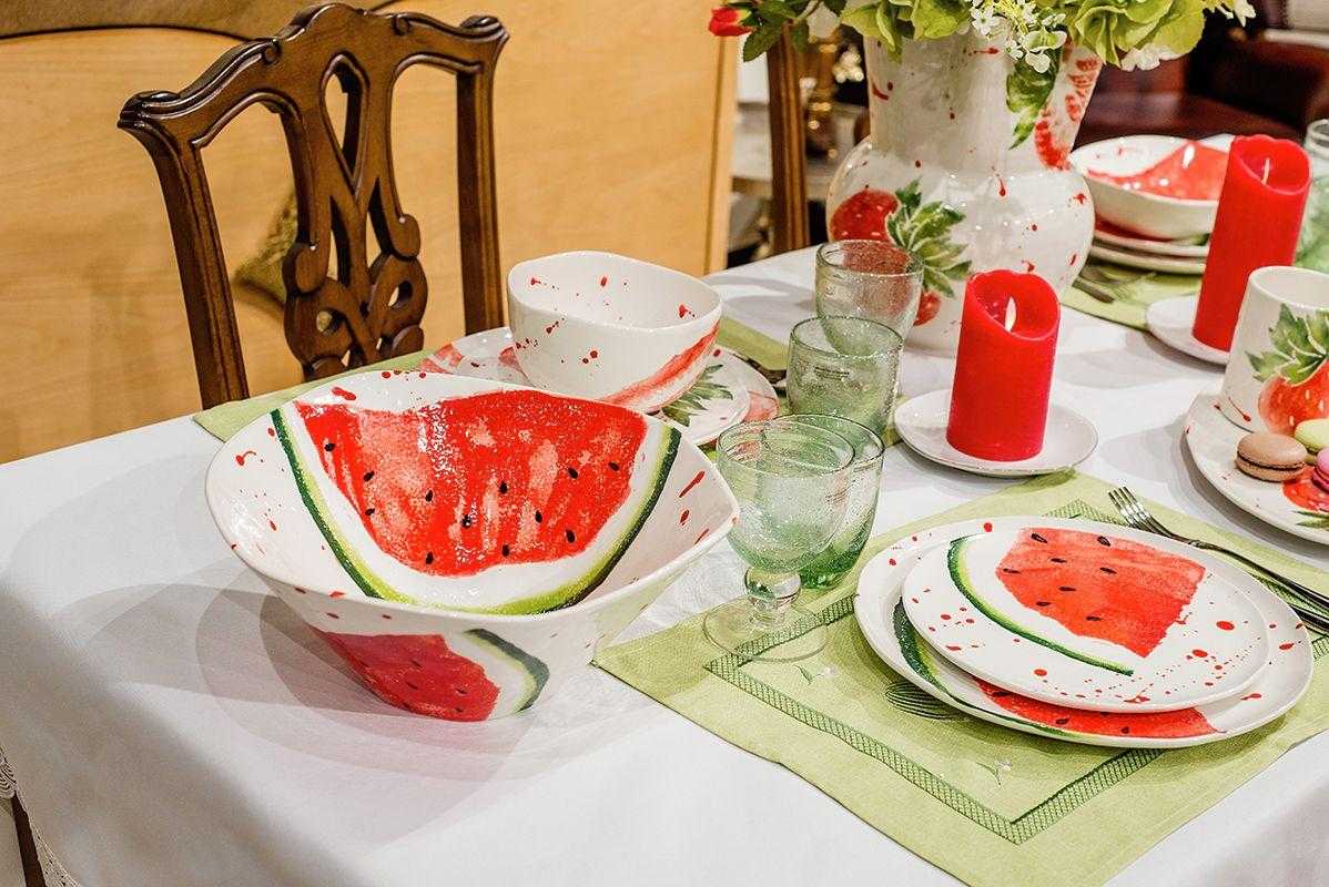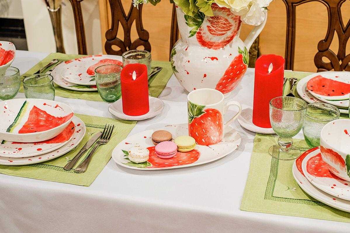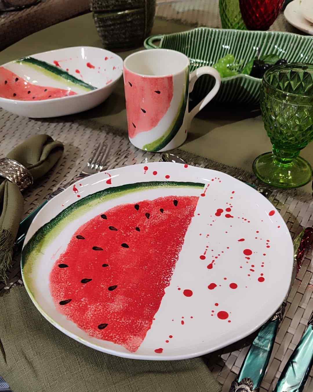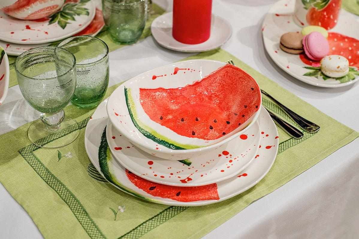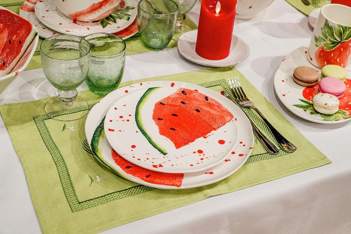 Обеденная тарелка «Фруктовый коктейль» с арбузом от Villa Grazia наполнит ваш стол сочностью и летним настроением. Яркий рисунок спелого арбуза выглядит настолько реалистично, что хочется сразу насладиться прохладным вкусом свежего фрукта. Контраст красного и зеленого оттенков на белоснежной поверхности создаёт эффект праздника и мгновенно привлекает внимание.