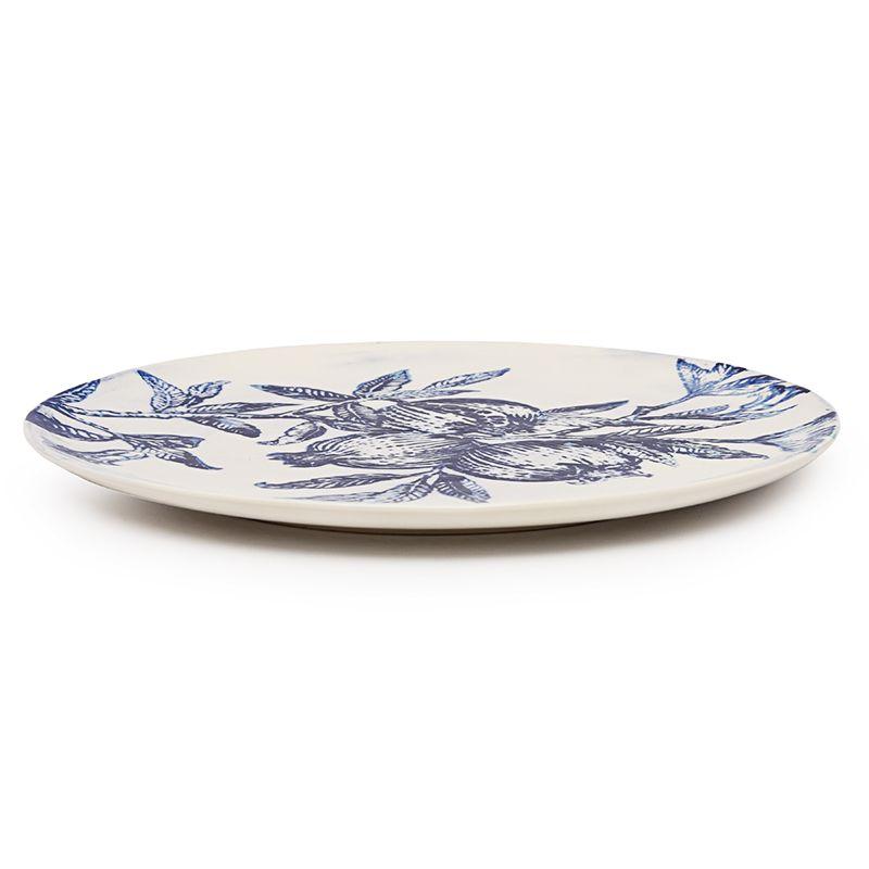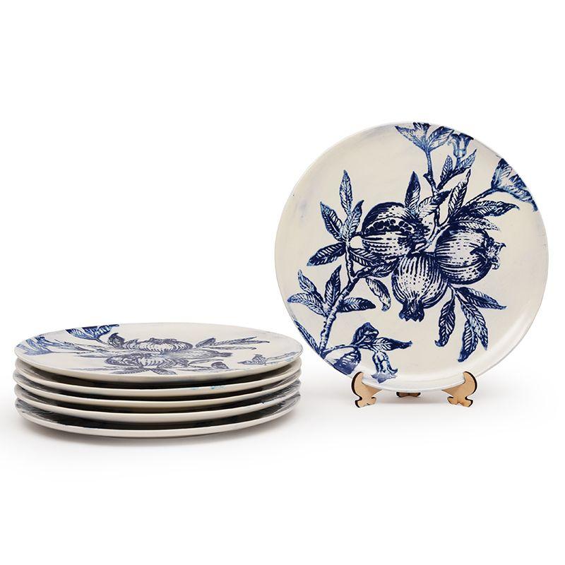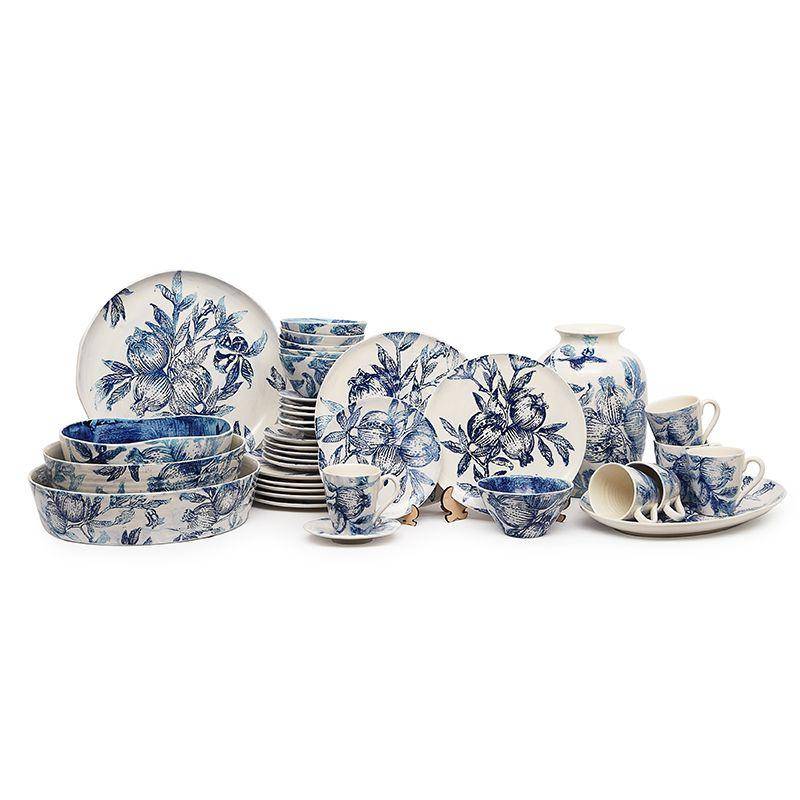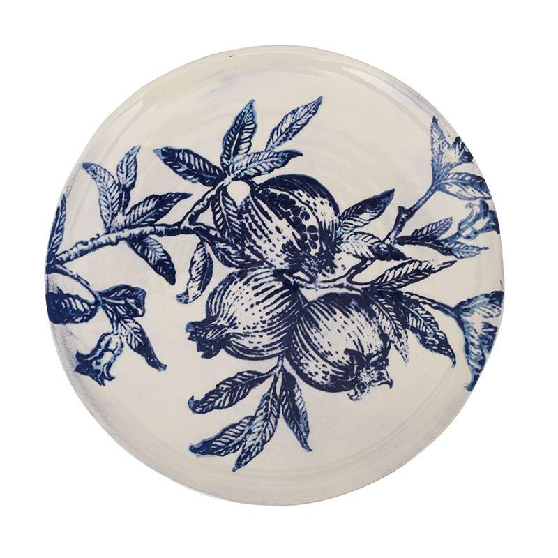 Пышный гранатовый куст в синих вечерних сумерках – концепт, который искусно воплотили итальянские мастера. Коллекция белоснежной глянцевой керамики ручной работы украшена натюрмортом в прохладных голубых и синих оттенках. На рисунке с характерной акварельной размытостью изображены ветки граната с плодами и цветами.
