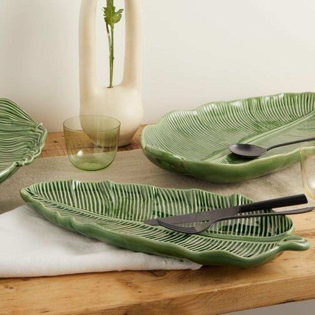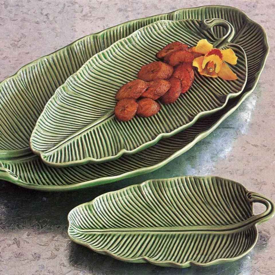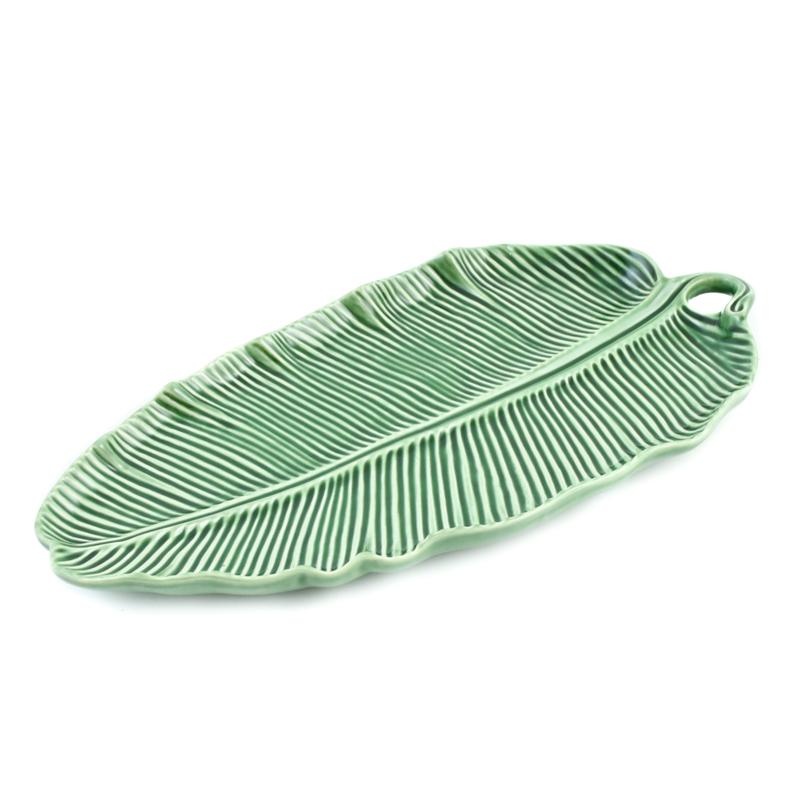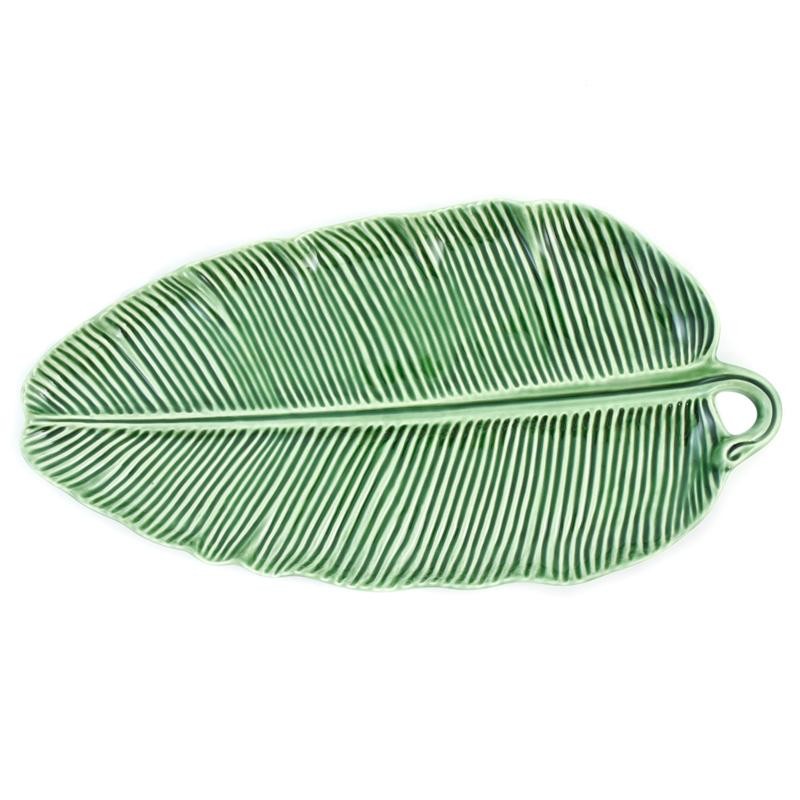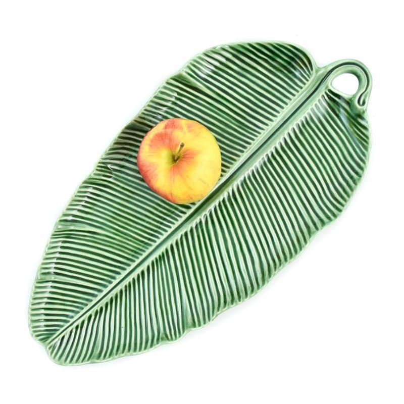 Ця велика й широка модель має форму листка бананової пальми. Вона виконана в природному зеленому відтінку та доповнена рельєфними прожилками, що покривають поверхню.