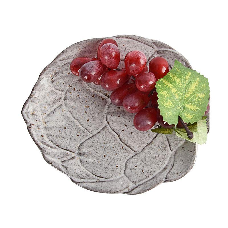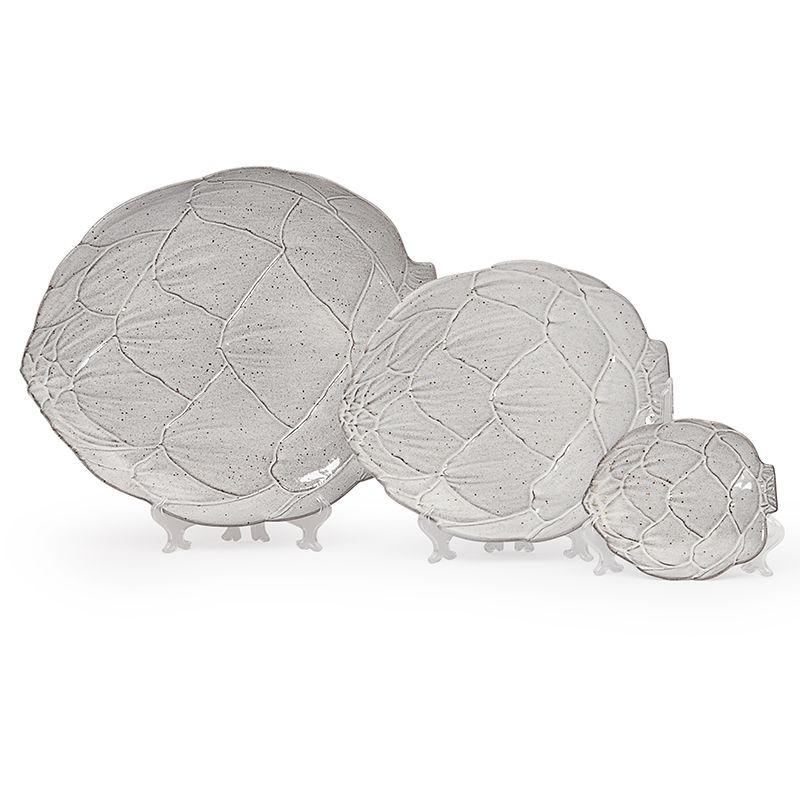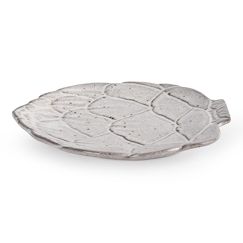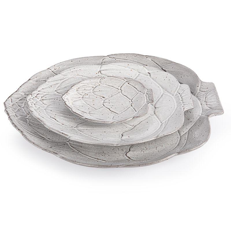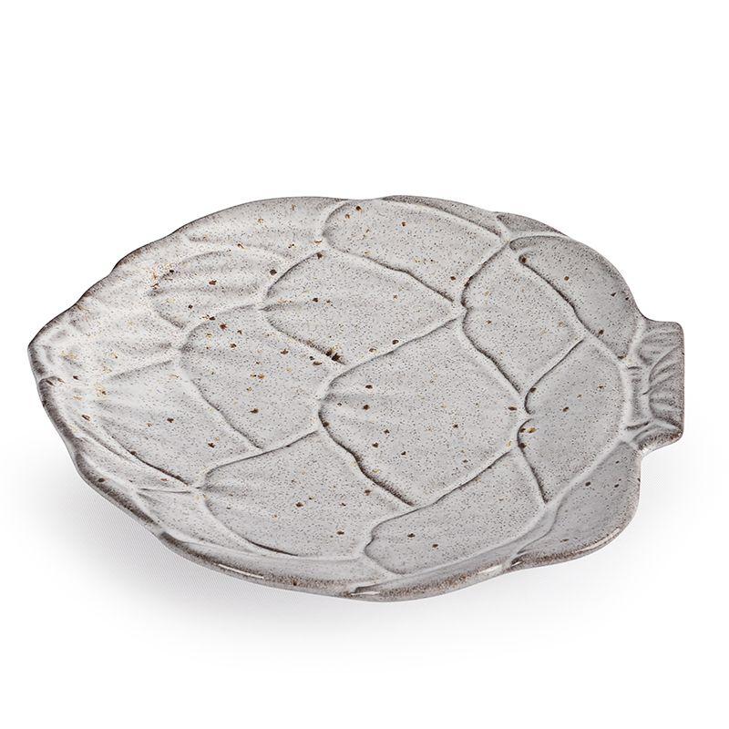 Керамічна пиріжкова тарілочка з рельєфною поверхнею у формі листя артишоку. Серія посуду, до якої належить цей виріб, удостоєна престижної дизайнерської відзнаки German Design Award 2019. Унікальну колекцію художньої майоліки португальські майстри виконують у двох палітрах — білій та зеленій.
