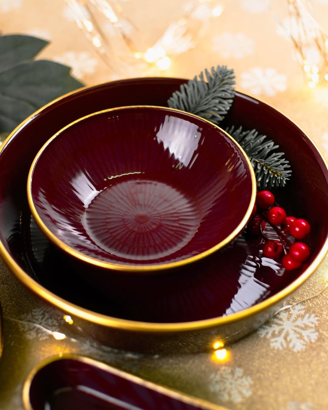 Колекція Bordeaux — це втілення глибокої естетики та стриманої розкоші. Насичений винний відтінок посуду нагадує оксамит — м’який, глибокий, з легким блиском. Золота облямівка додає шляхетності та підкреслює вишуканість кожної тарілки.