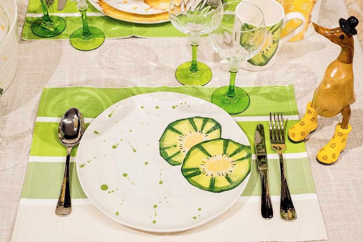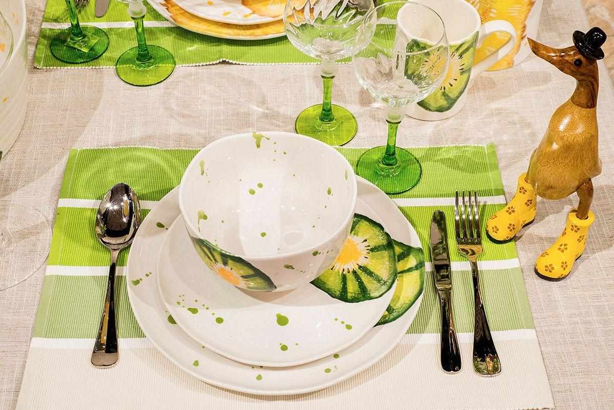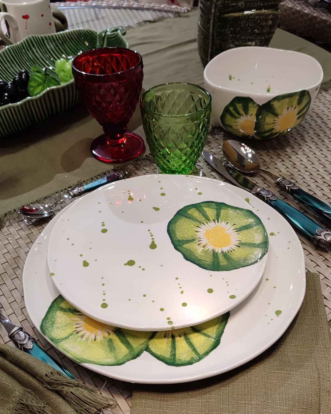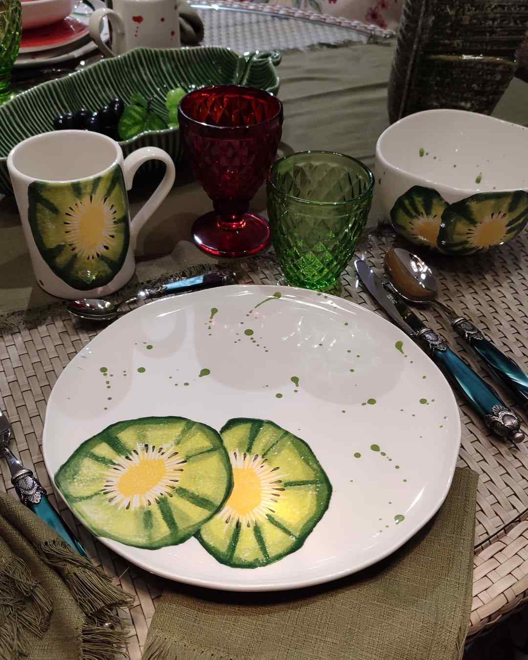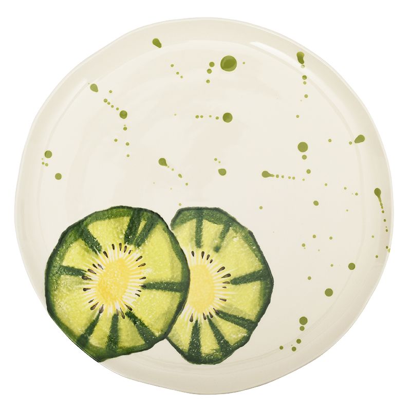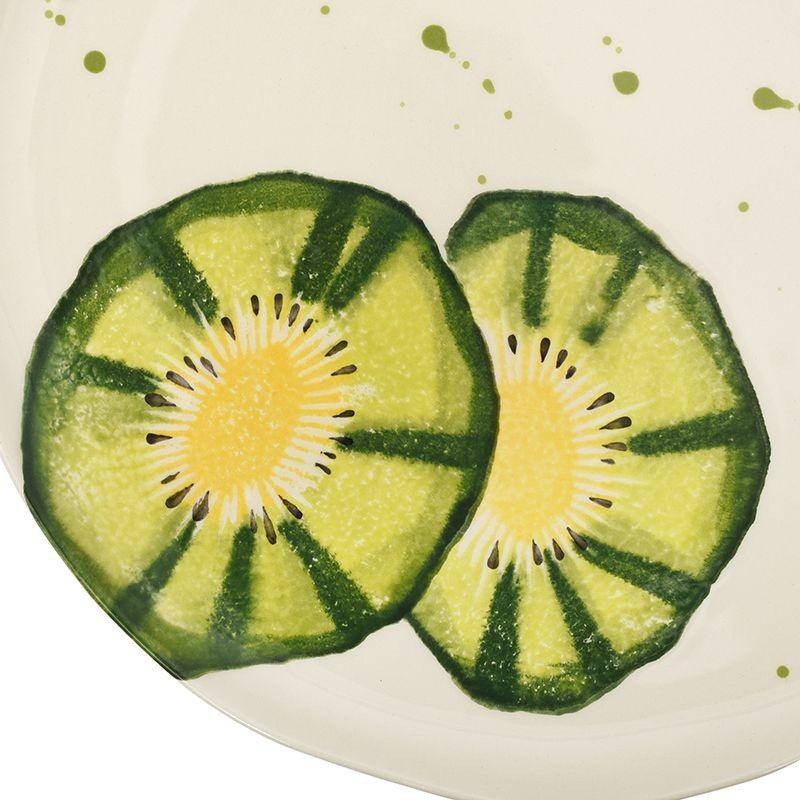 Обідня тарілка «Фруктовий коктейль» з ківі від Villa Grazia наповнює стіл свіжістю та гармонією літніх барв. Натуральний малюнок стиглого фрукта, виконаний у м’якій акварельній техніці, виглядає реалістично та викликає апетит. Білосніжне тло й хаотичні зелені бризки надають виробу живості та створюють настрій легкості.