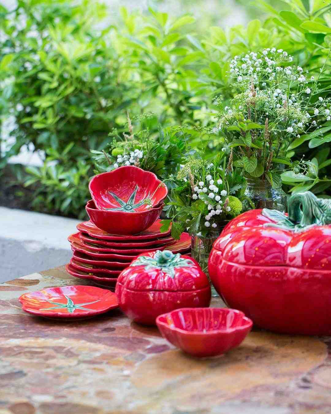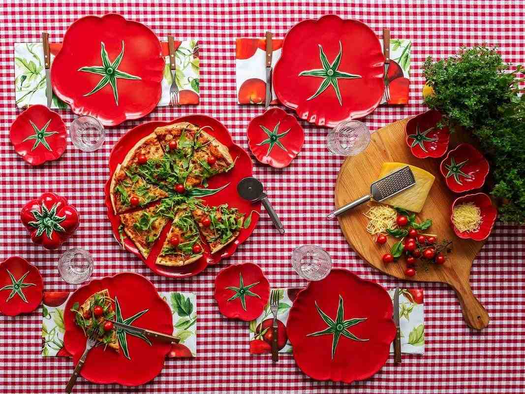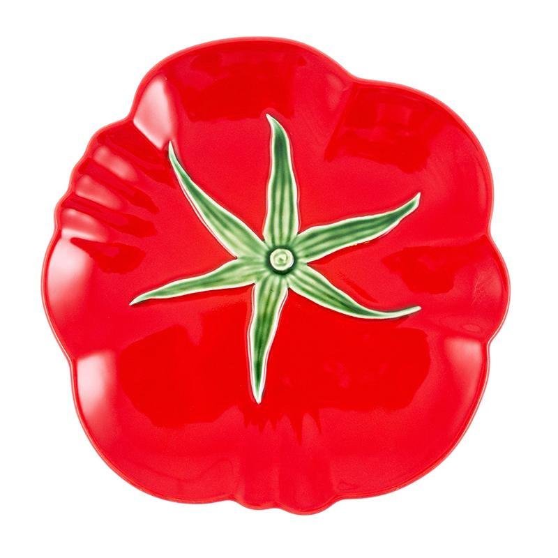 Велика керамічна тарілка, яку можна використовувати як обідню, підставну або як блюдо для подачі закусок. Незвичайна модель зовні нагадує об’ємну половинку великого стиглого помідора, при цьому має звичну заглиблену форму з невисокими фігурними краями. Посуд виготовляють методом ручного формування з міцної, якісної майоліки.
