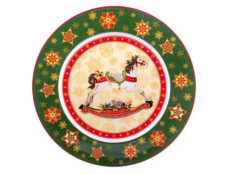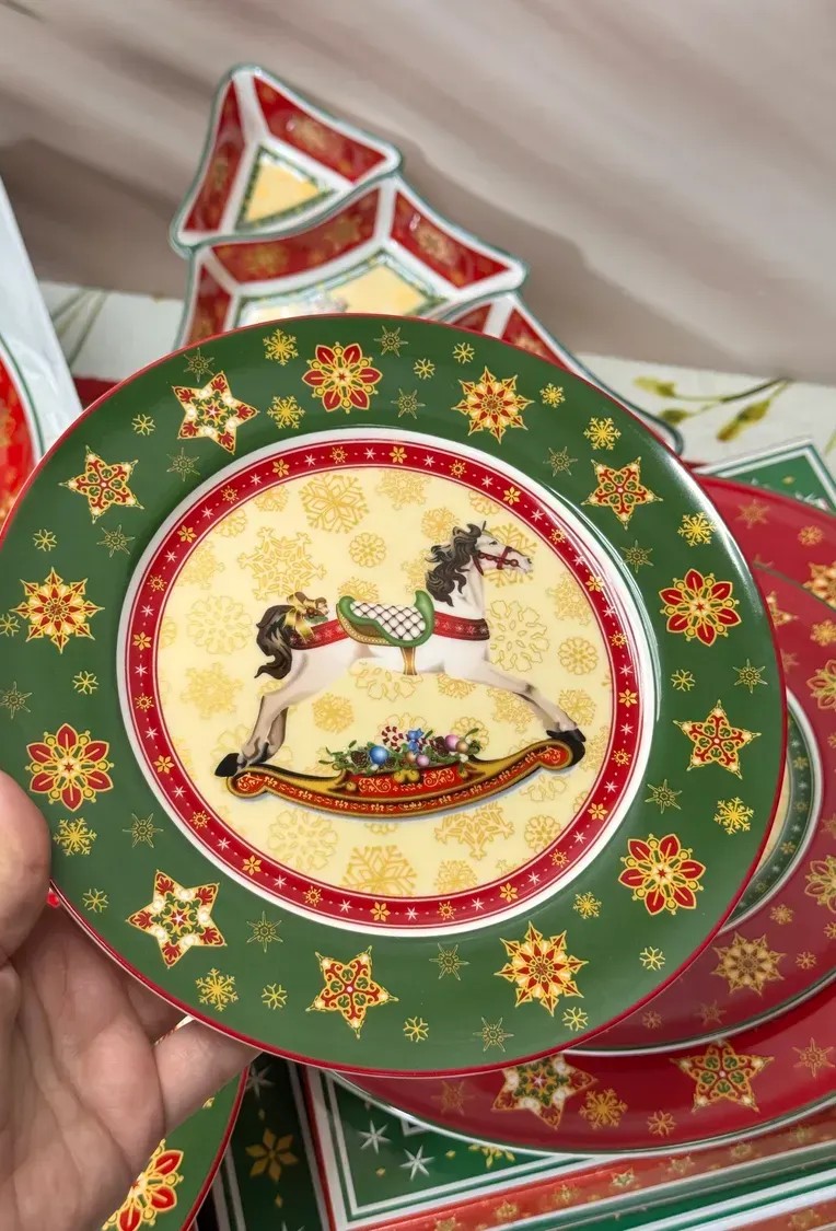 Фарфорові тарілки Christmas Collection — це справжні святкові акценти, що перетворюють звичайну сервіровку на яскраву зимову прикрасу столу. Благородна форма та насичені кольори створюють відчуття тепла й радості, а центральне зображення витонченої конячки-гойдалки нагадує про дитинство, очікування свята та затишок родинних вечорів. Кожна деталь візерунка — від золотавих сніжинок до червоних зірок — промальована з особливою точністю, щоб передати атмосферу Нового року.