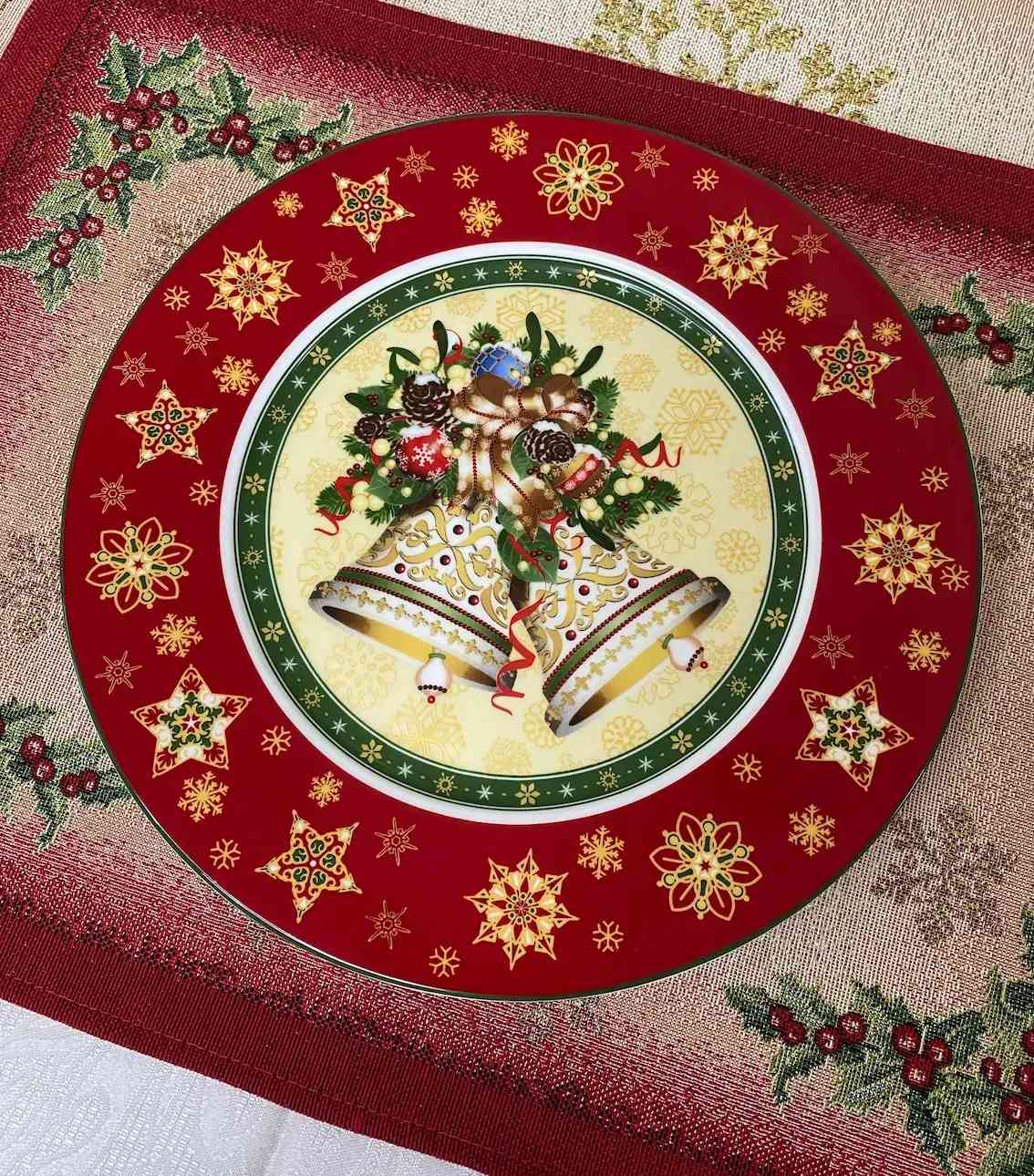 Фарфорова тарілка Christmas Collection — це яскрава прикраса святкового столу. Червоне тло із золотими сніжинками та зеленою окантовкою створює ефект урочистості й затишку. Центральний малюнок із дзвіночками, стрічками та ялиновими гілками символізує радість і передчуття свята. Такий посуд додає оселі тепла й стає виразним акцентом сервірування.