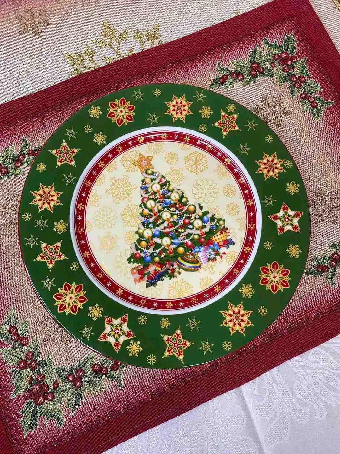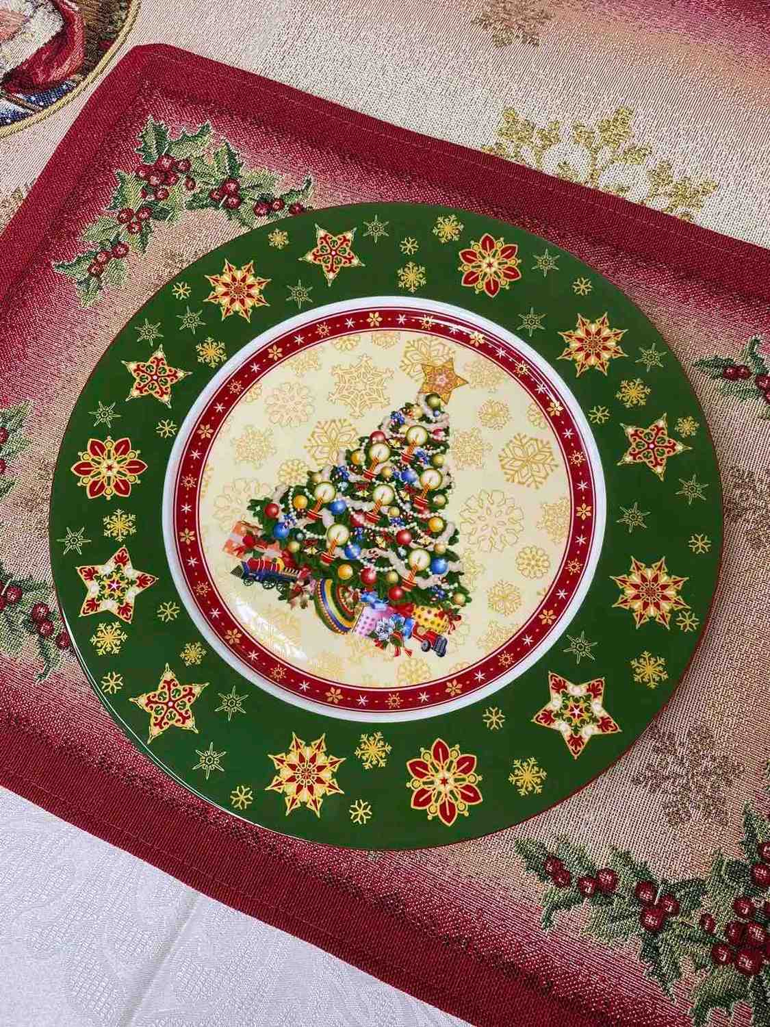 Фарфорові тарілки Christmas Collection із зеленим фоном і різдвяною ялинкою в центрі наповнюють оселю відчуттям тепла й радості. Яскравий малюнок із золотими сніжинками та червоними зірочками додає сервіровці виразності та святкового настрою. Такий посуд створює затишок і підкреслює особливість сімейних зустрічей.