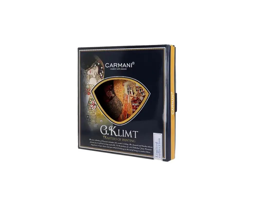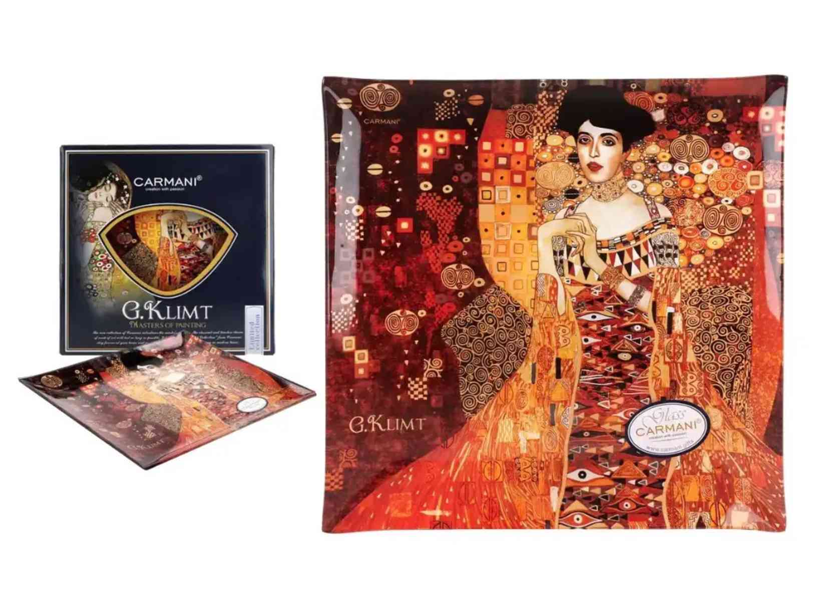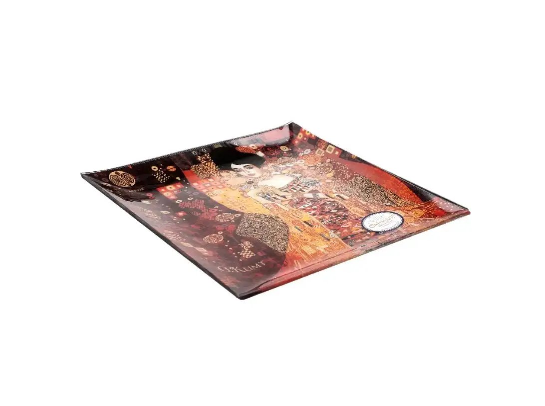 Ця скляна тарілка Carmani з образом Адель за мотивами Густава Клімта виглядає як справжній фрагмент художнього полотна, перенесений на сервірування. Глибокі відтінки червоного, золота та охри переплітаються у складних орнаментах, створюючи відчуття розкоші, тепла й чуттєвості. У центрі композиції — граційний жіночий образ, який притягує погляд і робить тарілку яскравим акцентом інтер’єру або святкового столу.