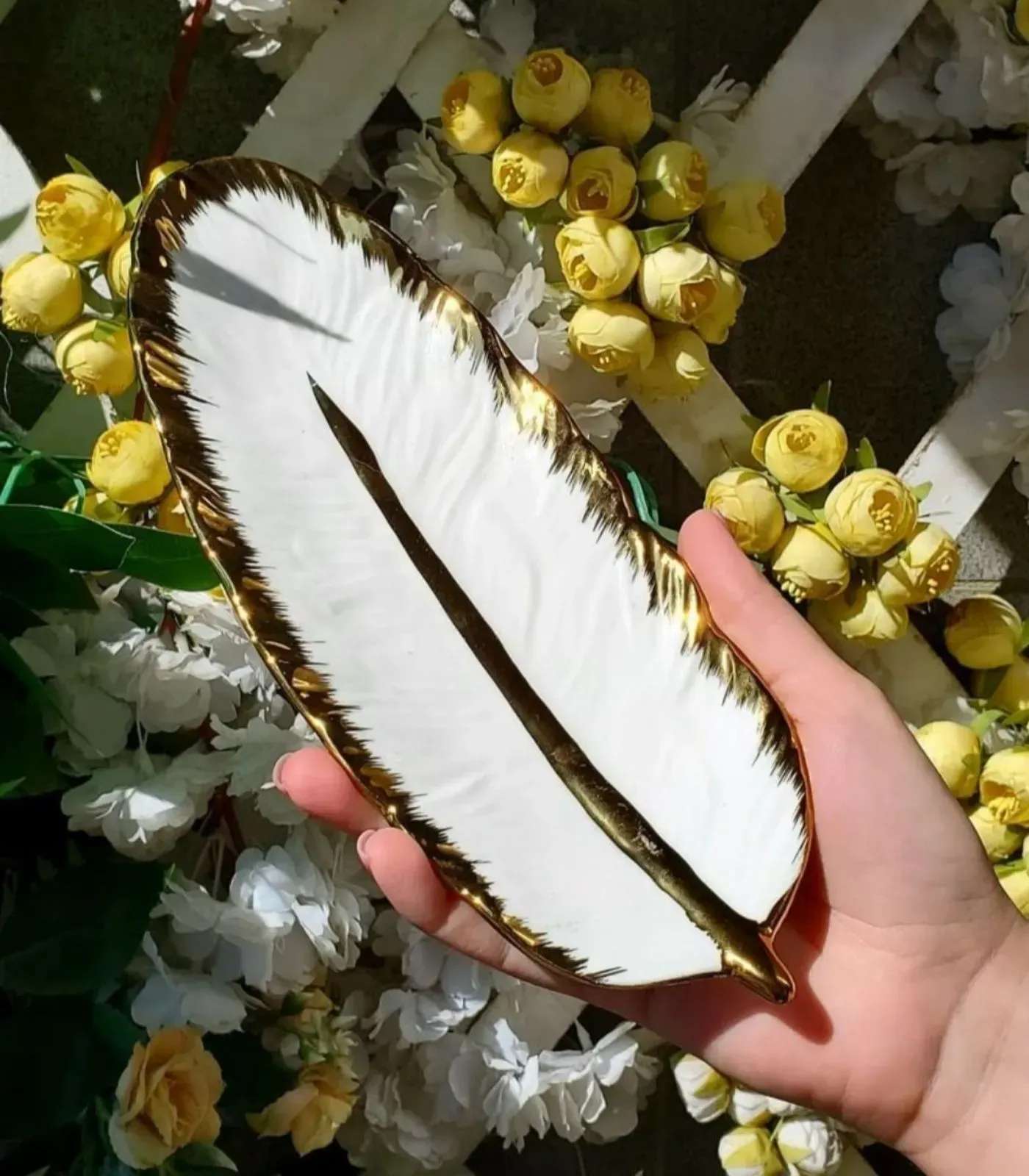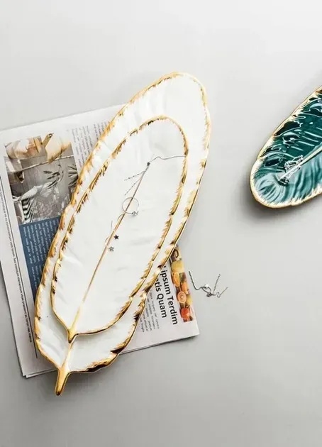 Зелена, біла, рожева - це не звичайні тарілки — це декоративні акценти, які створюють настрій у просторі. Кожна модель у формі пера з виразним рельєфом і золотою окантовкою виглядає, ніби щойно злетіла з ескізу дизайнера. І саме те, що ці тарілки не призначені для їжі, надає їм ще більшої виразності.