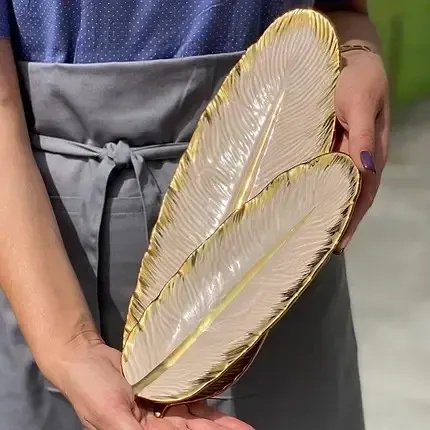Це не звичайні тарілки — це декоративні акценти, які створюють настрій у просторі. Кожна модель у формі пера з виразним рельєфом і золотою окантовкою виглядає, ніби щойно злетіла з ескізу дизайнера. І саме те, що ці тарілки не призначені для їжі, надає їм ще більшої виразності.