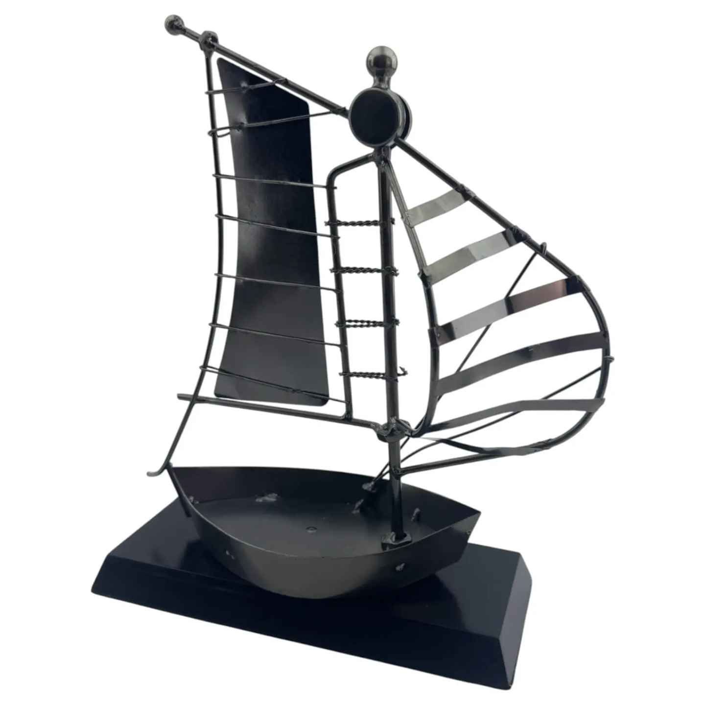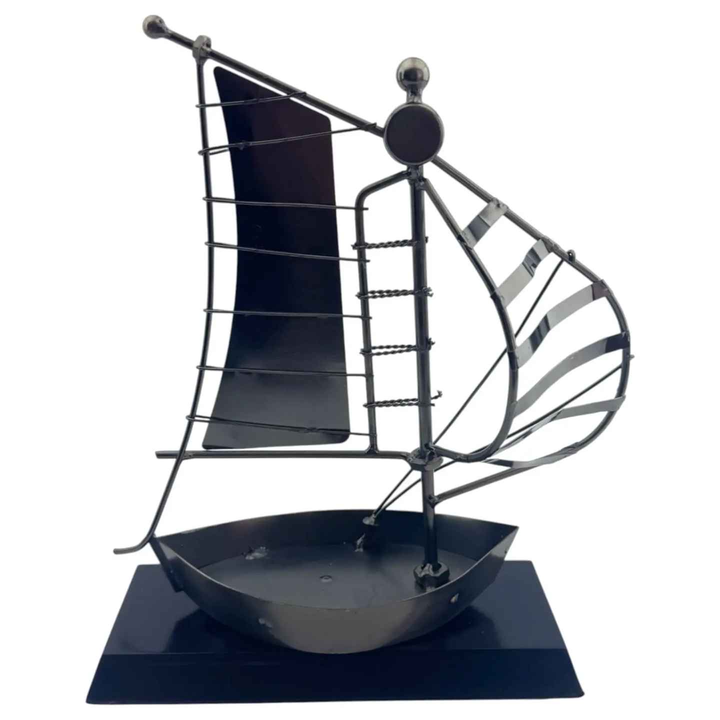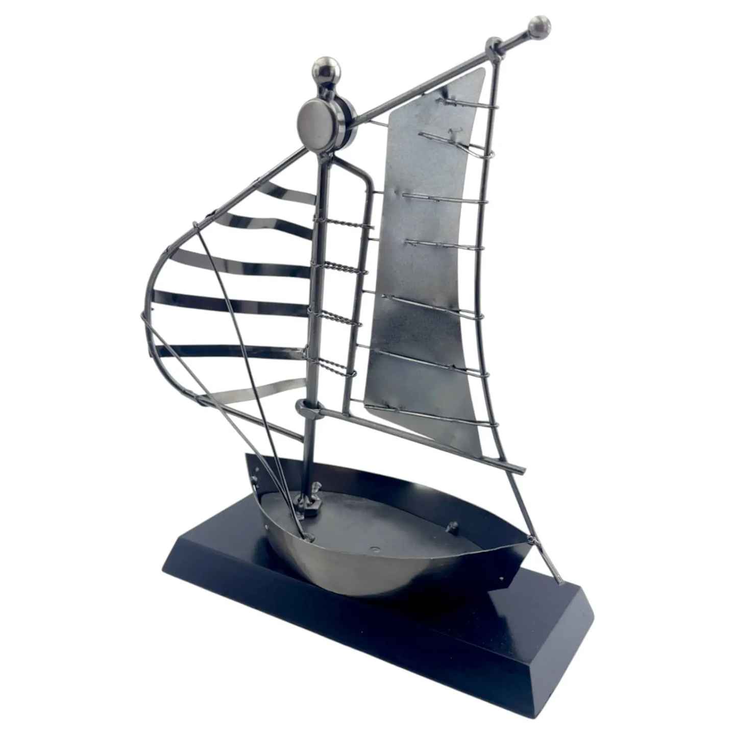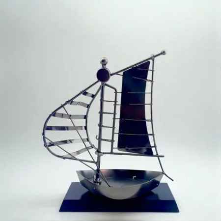 Декоративная композиция «Парус» в стиле техно-арт — необычный интерьерный объект, в котором морская тематика органично сочетается с индустриальной эстетикой. Конструкция парусника выполнена из металлических элементов, напоминающих детали механизмов и конструктора, что придаёт изделию характер и выразительность.