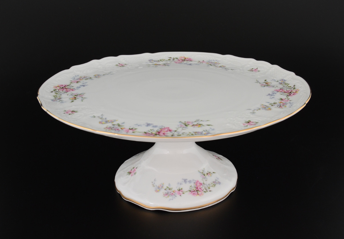 Тортовница фарфоровая белая с рисунком Thun Bernadotte Дикая Роза с золотой каймой 32 см