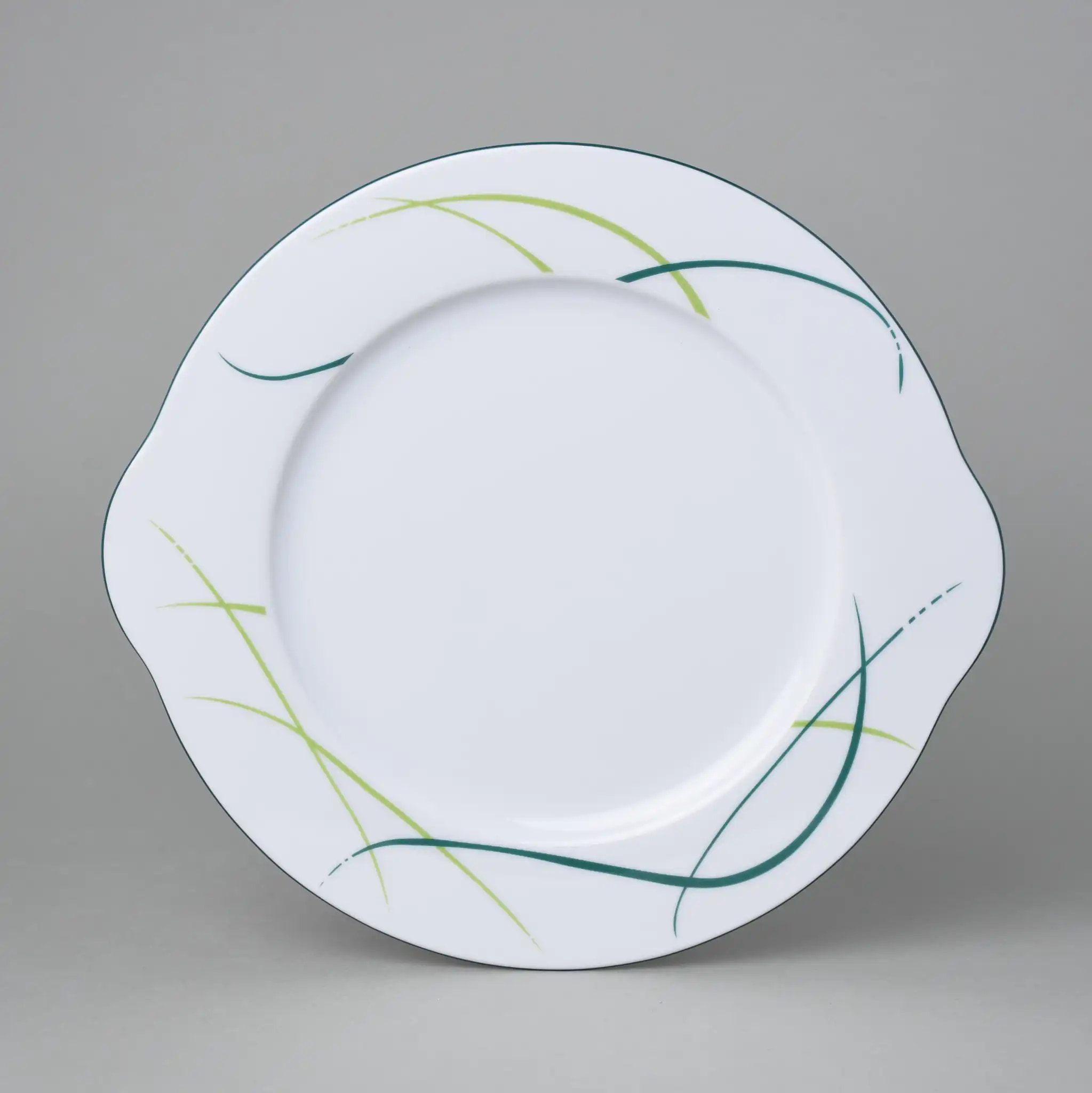 Порцелянова тортівниця Thun Opal діаметром 27 см — це не просто тарілка для десертів, а витончене рішення для вишуканої сервіровки. Білосніжна основа прикрашена графічним орнаментом у зелено-жовтій гамі, який додає легкості та гармонії. Завдяки зручним ручкам, тортівницю легко подавати до столу навіть з великою випічкою.