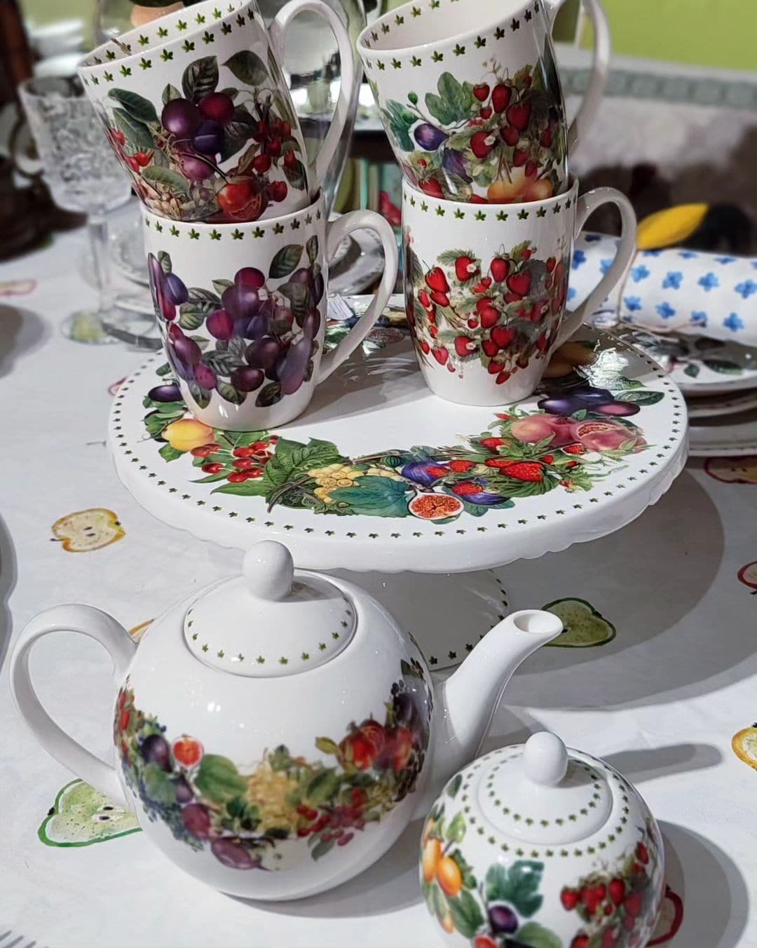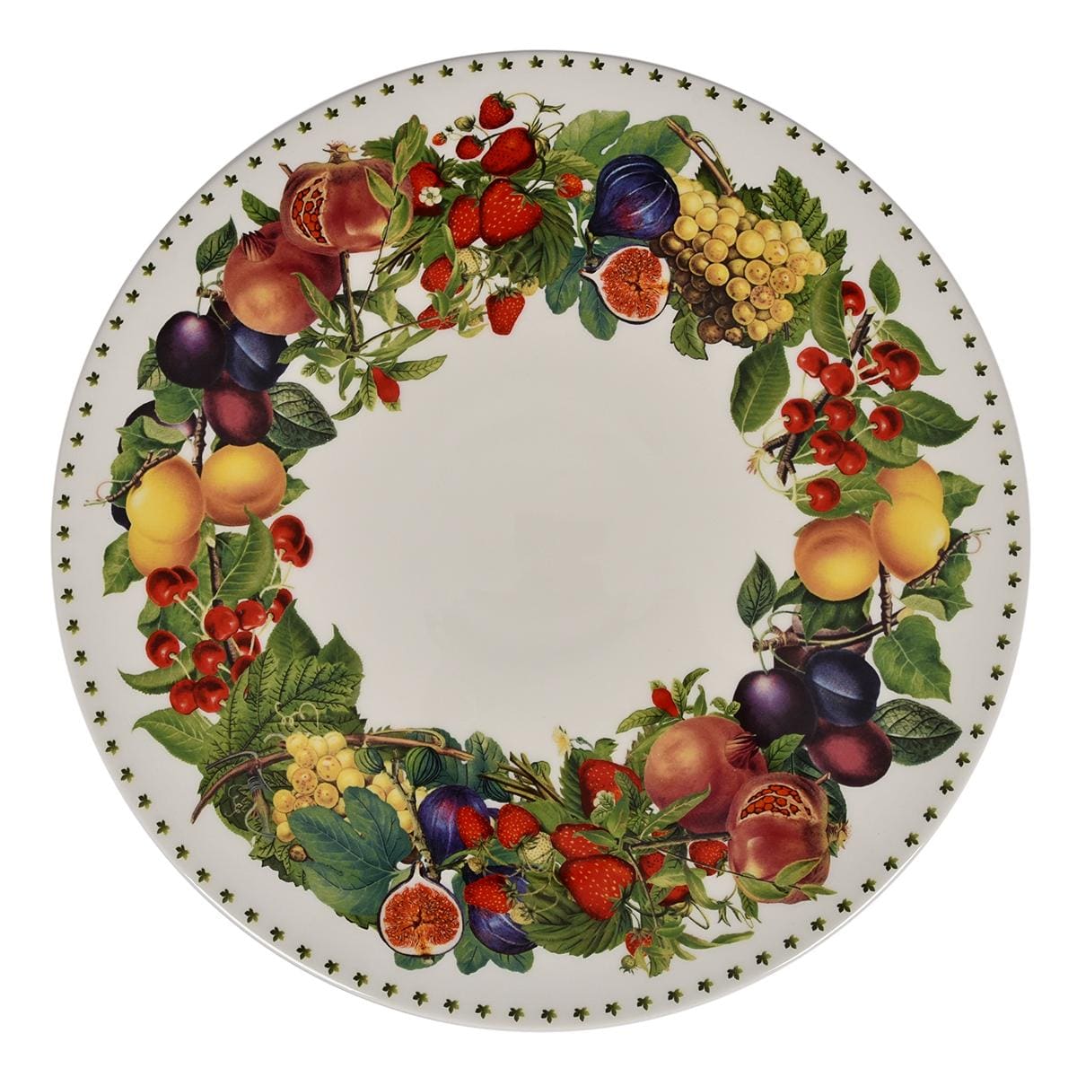 Большая тортовница, которую благодаря стойкой ножке несложно разместить на многосервированном столе. Сияющий белоснежный фарфор стал идеальным фоном для выразительного рисунка, насыщенного красками и тонкими деталями – словно на плоской поверхности разложены настоящие сочные плоды.