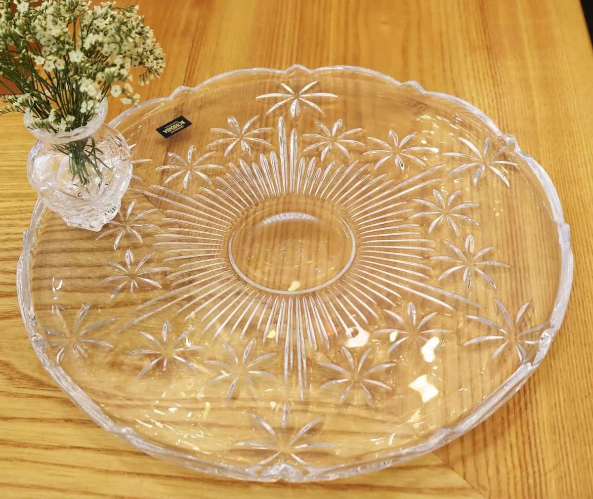 Блюдо для торта Perseus из прессованного хрустального стекла с добавлением окиси титана. Стандартная форма вазы, идущая на расширение в верхней части, подчеркивает естественную красоту нежных первоцветов и миниатюрных роз. Стильное изделие, которое отлично дополнит интерьер в классическом и современном стиле.