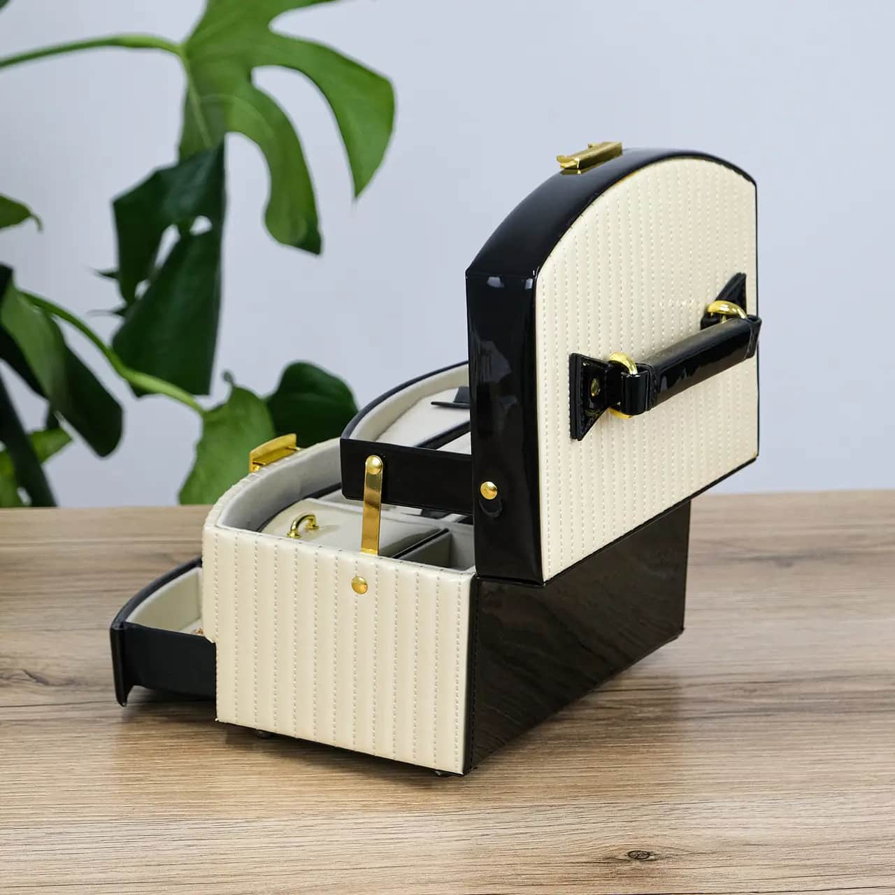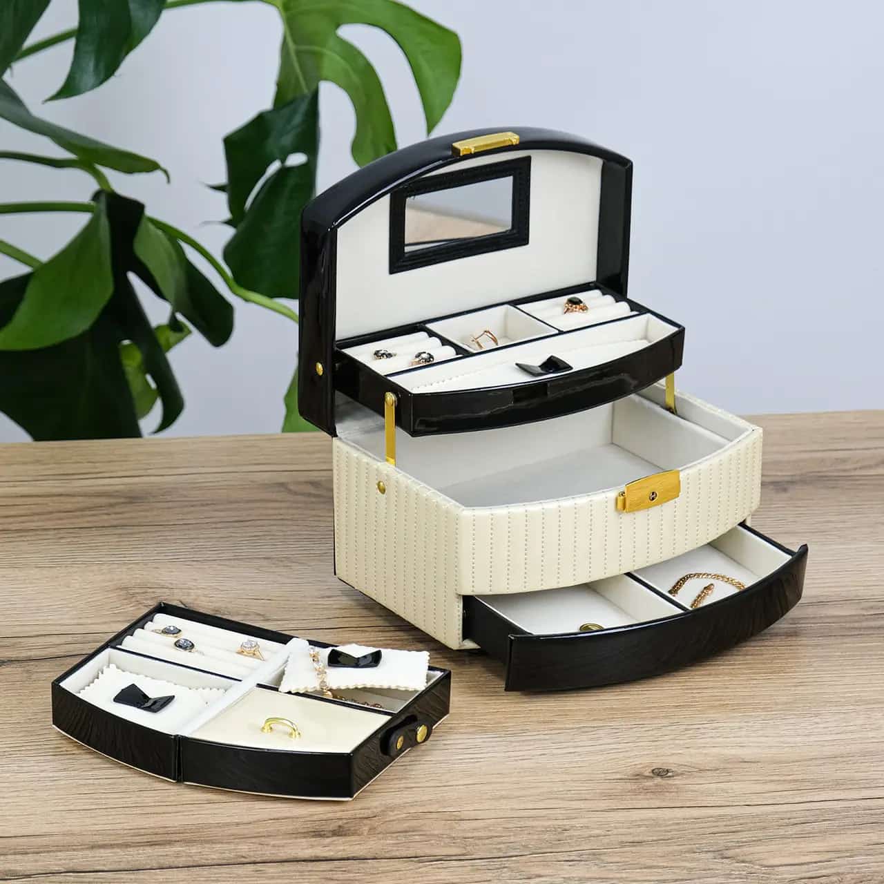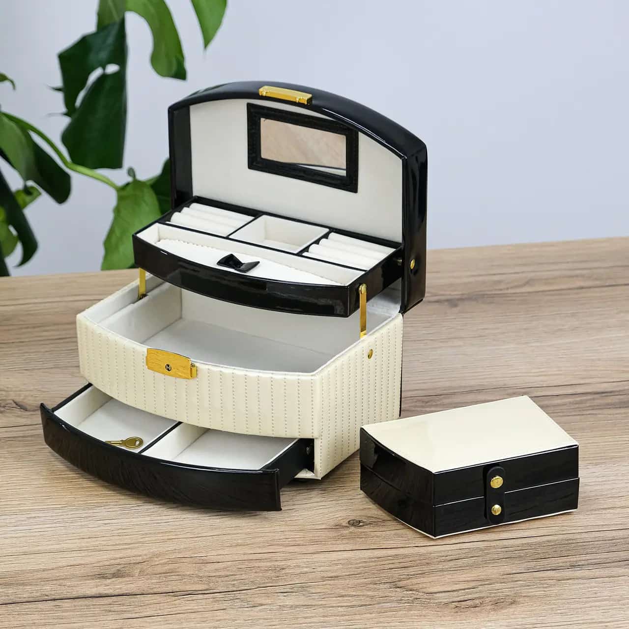 Трехъярусная шкатулка для украшений с зеркалом черно-белая с мини-кейсом