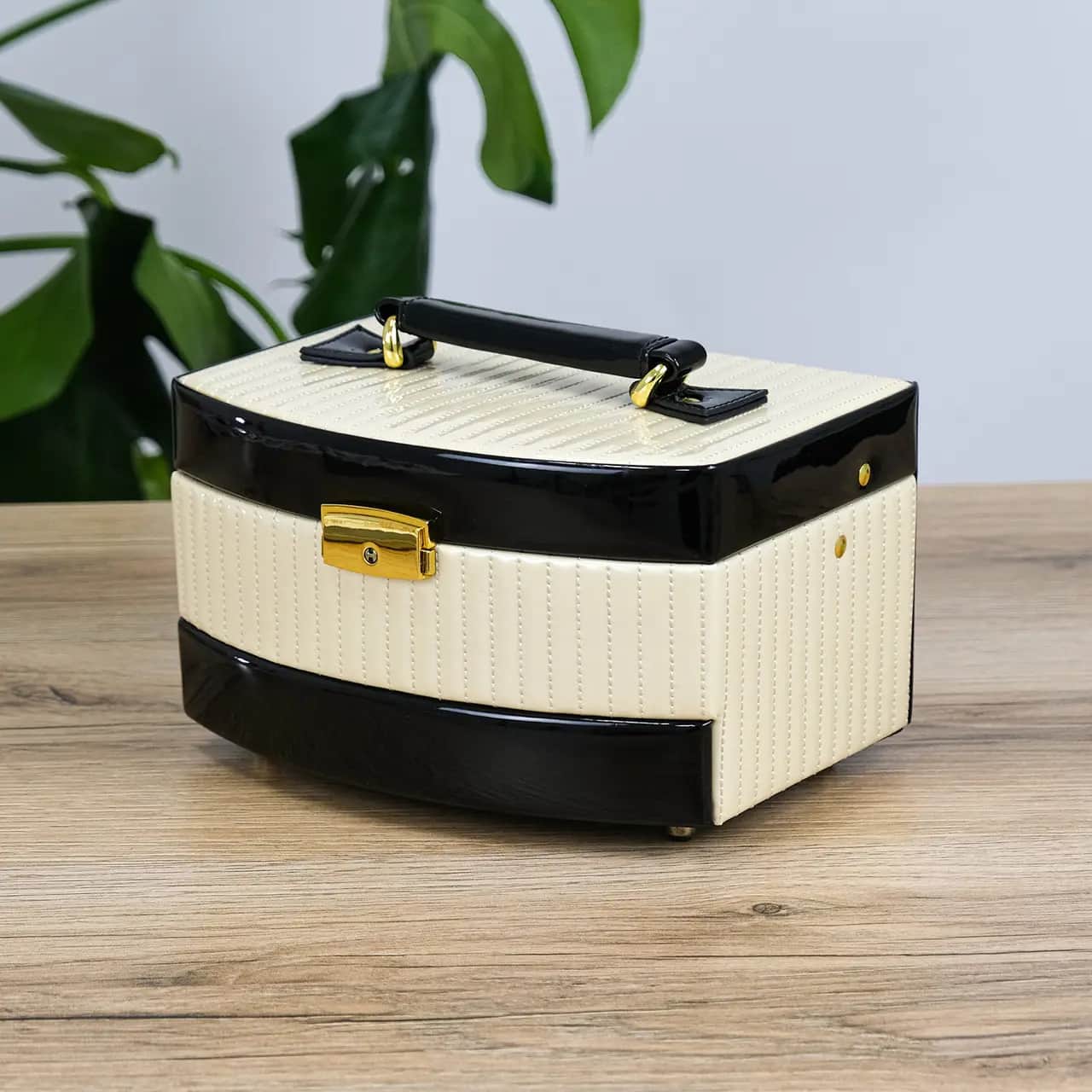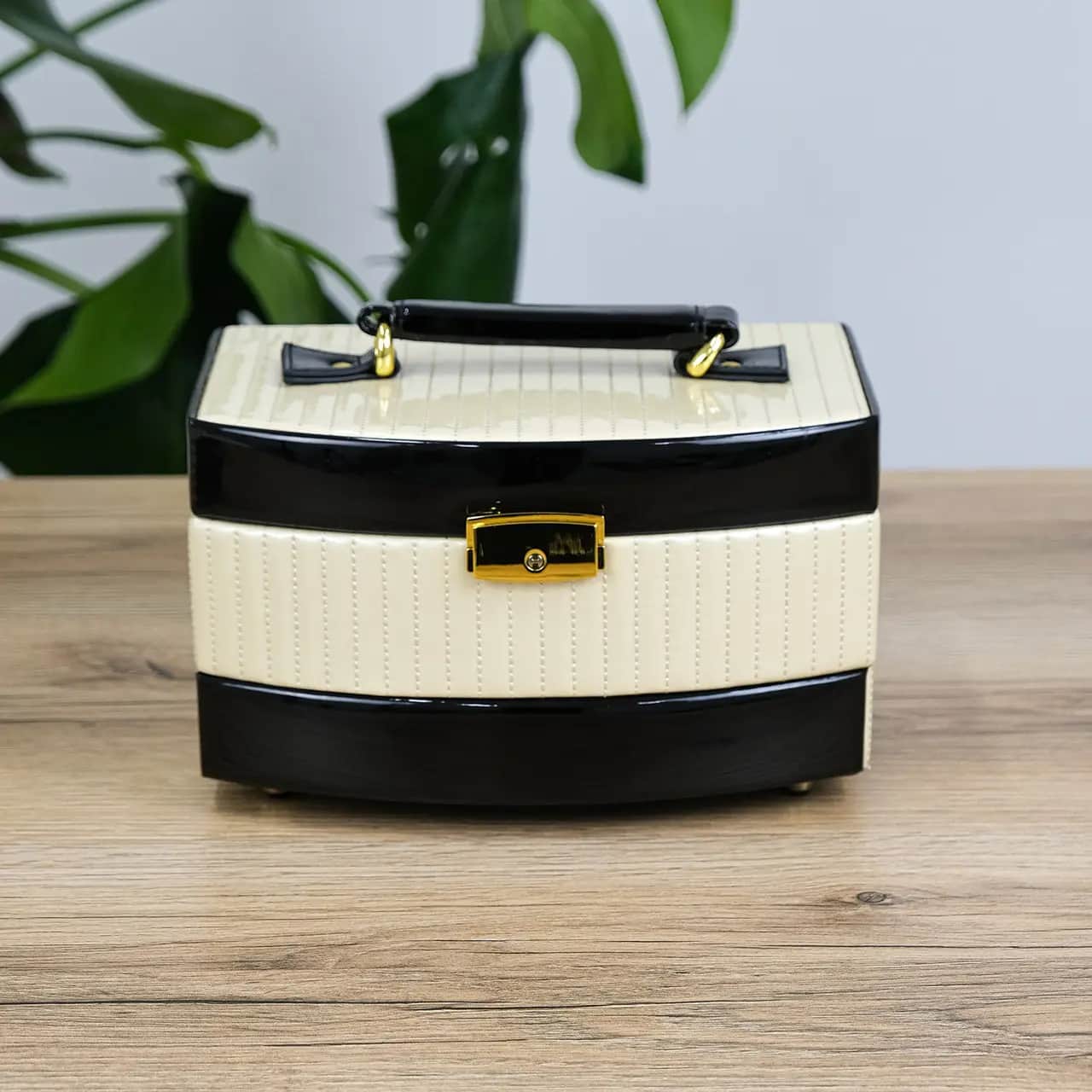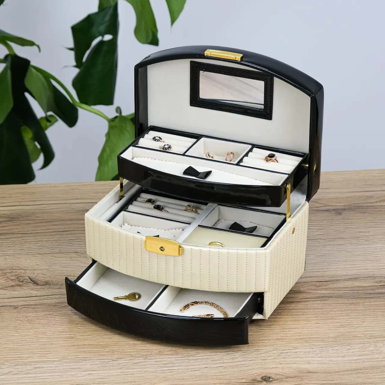 Трехъярусная шкатулка для украшений с зеркалом черно-белая с мини-кейсом