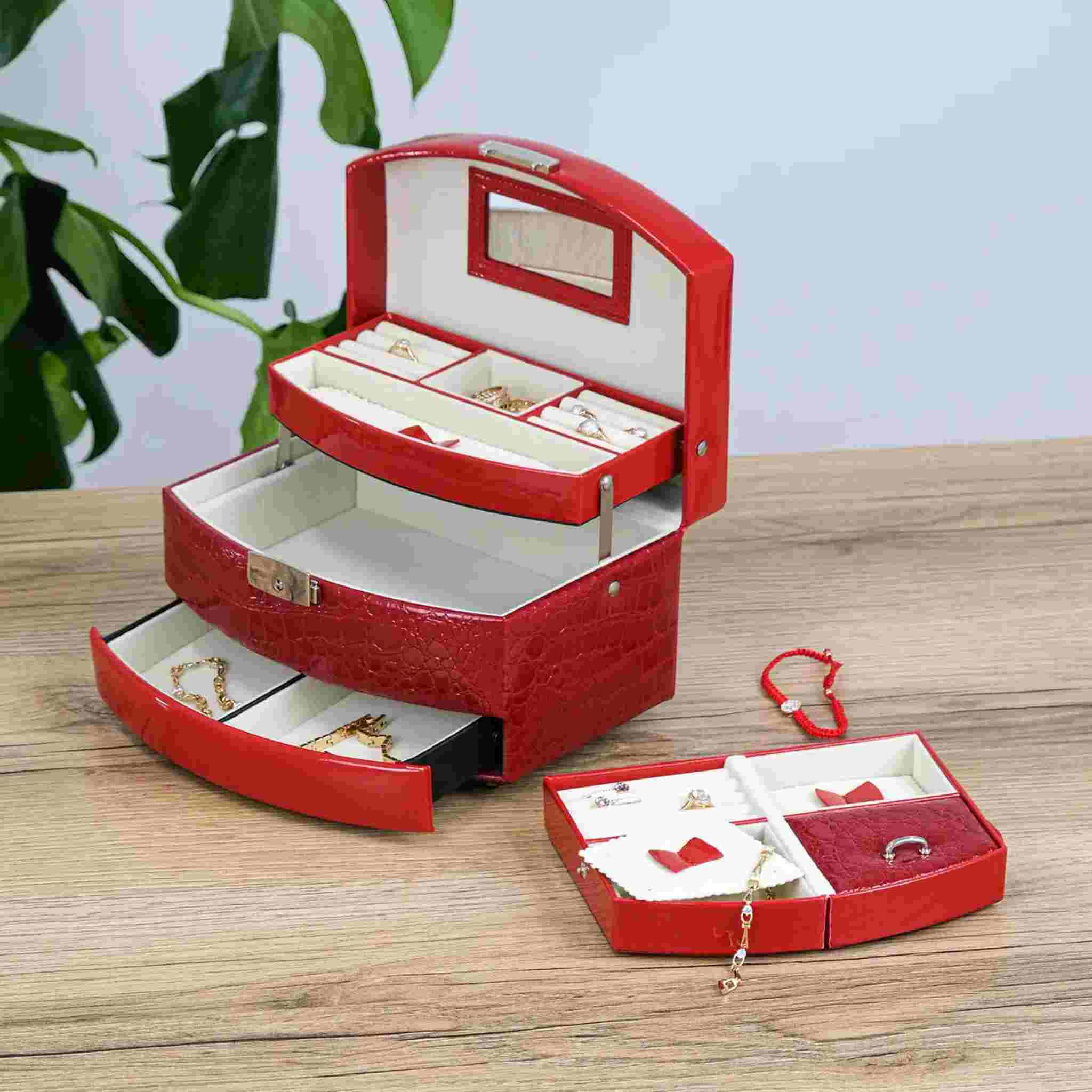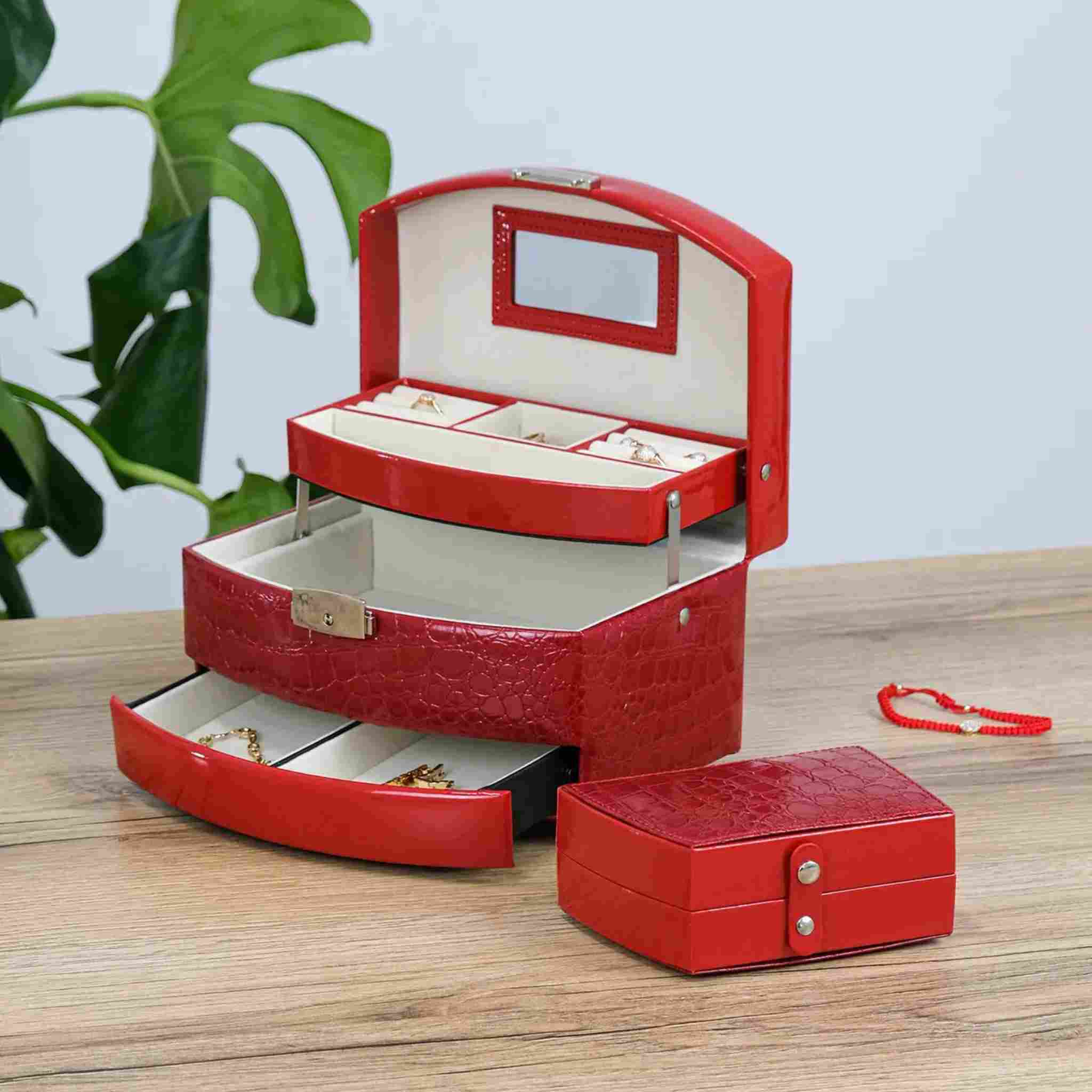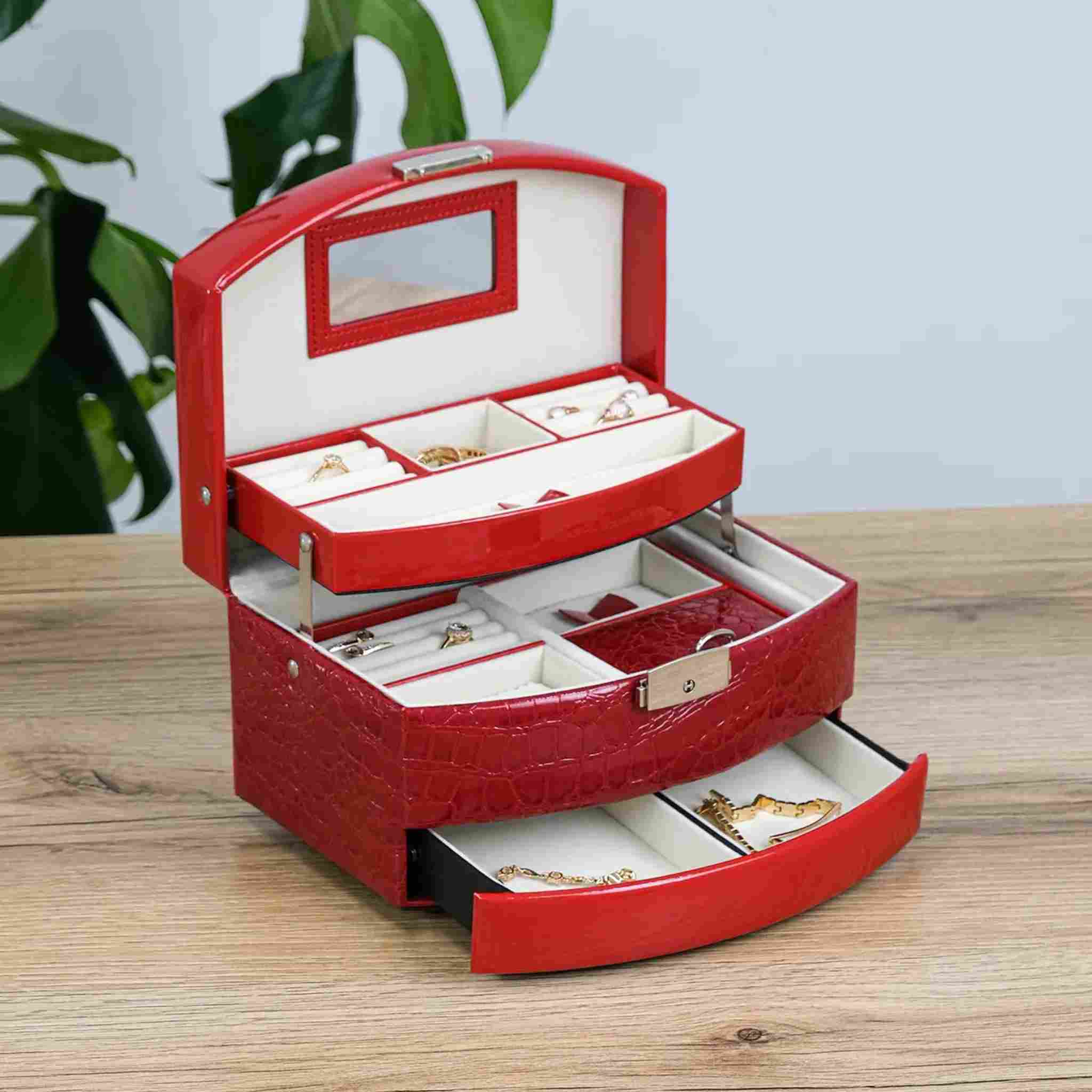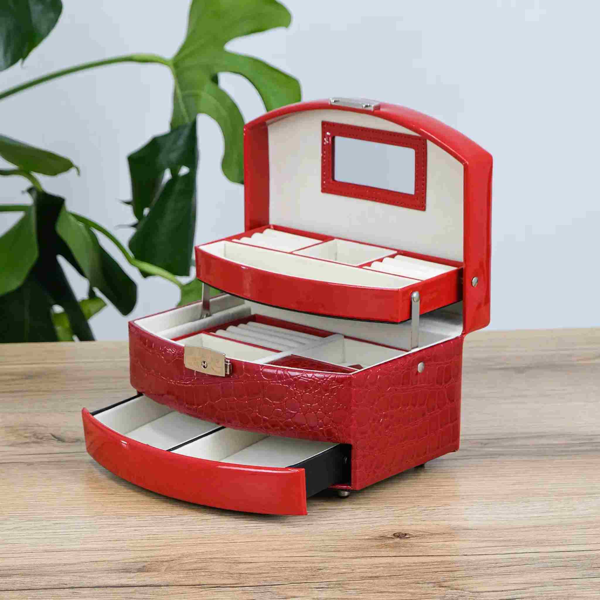 Трирівнева скринька для прикрас із дзеркалом, червона екошкіра