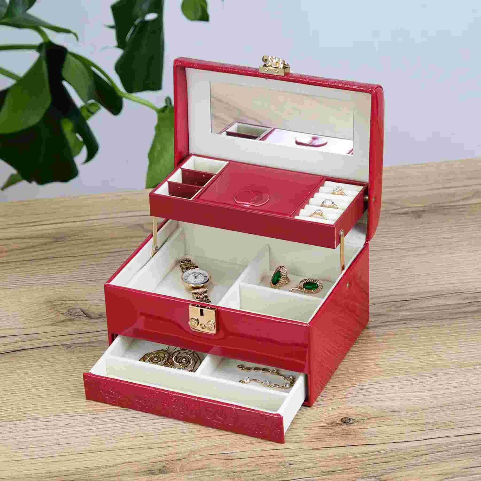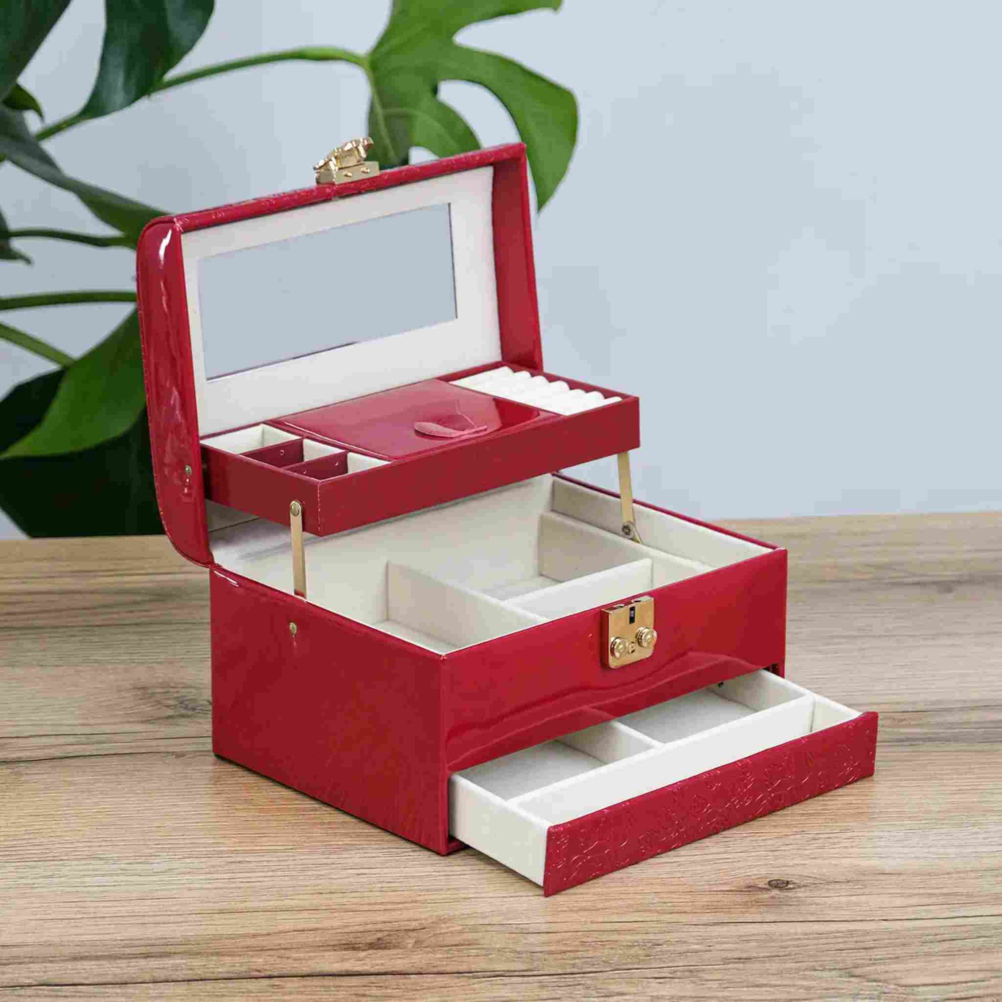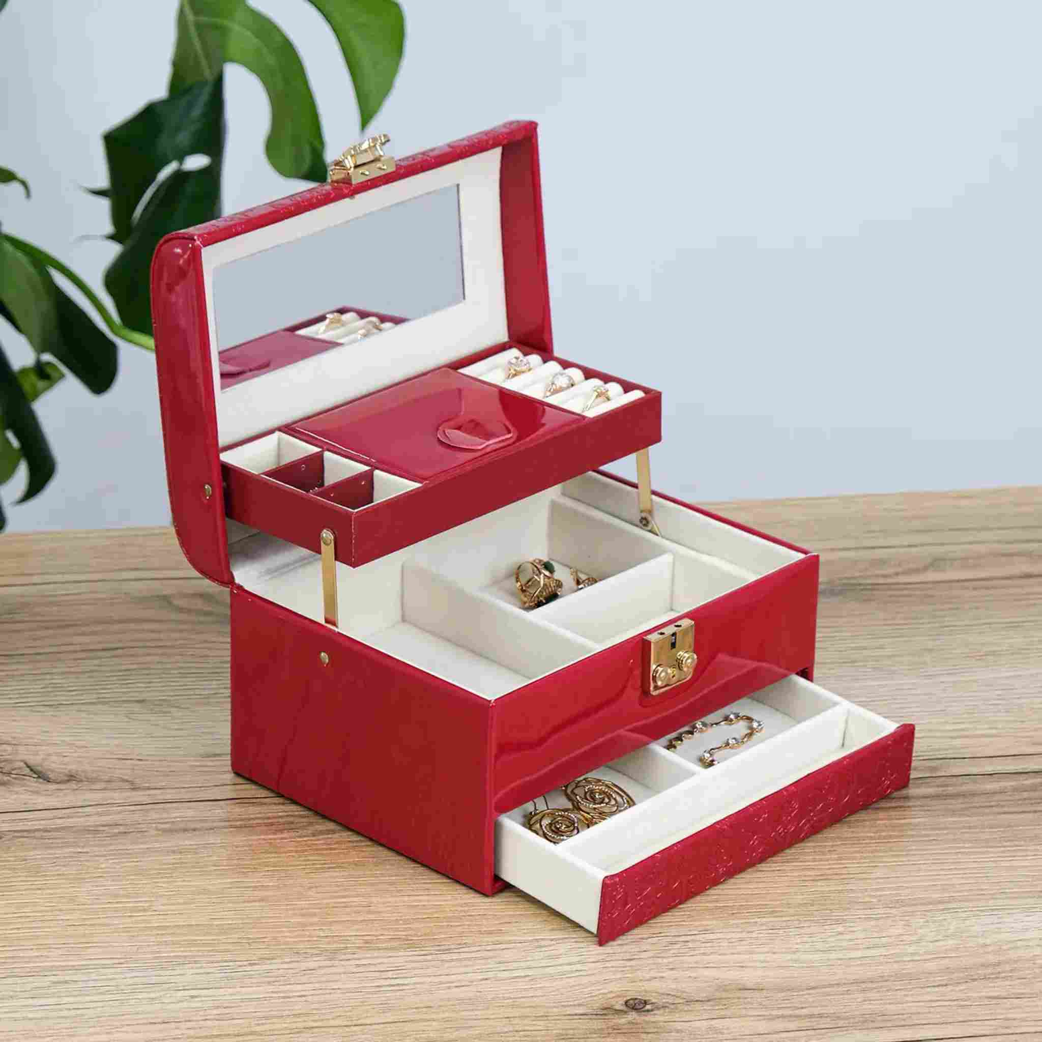 Триярусна скринька для прикрас із дзеркалом червоного кольору