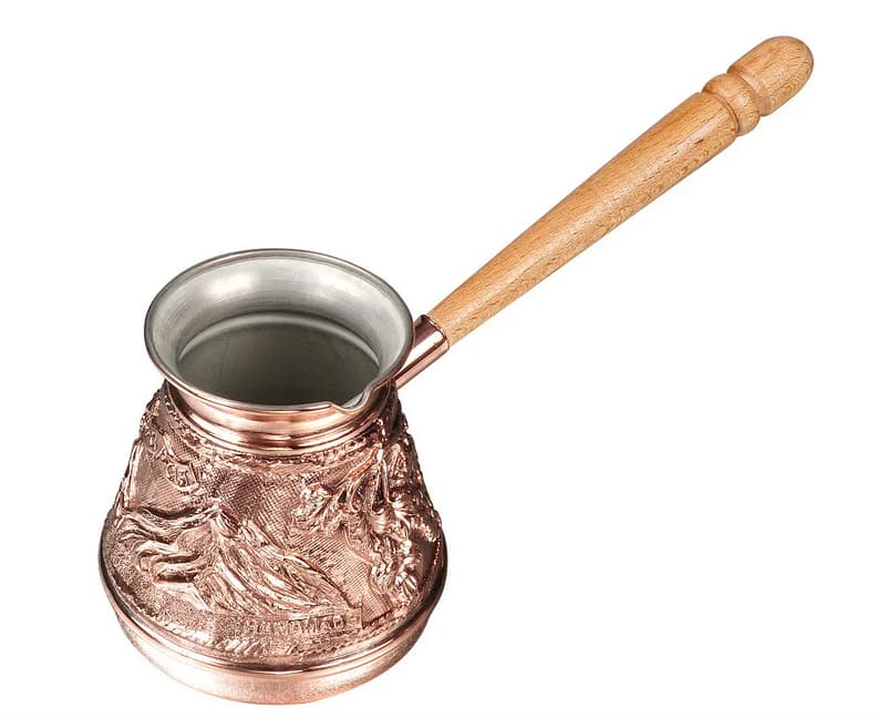 Красивая медная турка "Арарат" с удобной длинной деревянной ручкой. Изготавлена вручную мастерами Армении из листа чистой меди толщиной 1 мм. Эксклюзивная чеканка с изображением горы Арарат. Внутри турка покрыта пищевым оловом, имеет толстое дно и стенки. Подходит для приготовления кофе на электрических и газовых плитах, а так же других нагревающих поверхностях.