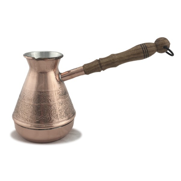 "Цветочный орнамент" - качественная турка из листовой меди толщиной 1.2 мм, изготовленная по цельнокатанной технологии. Для защиты от внешних воздействий, внутренние стенки и дно турки покрыты пищевым оловом, толщиной 9-12 мкм. Внешние стенки покрыты жаропрочным лаком и имеют натуральный медный блеск.
