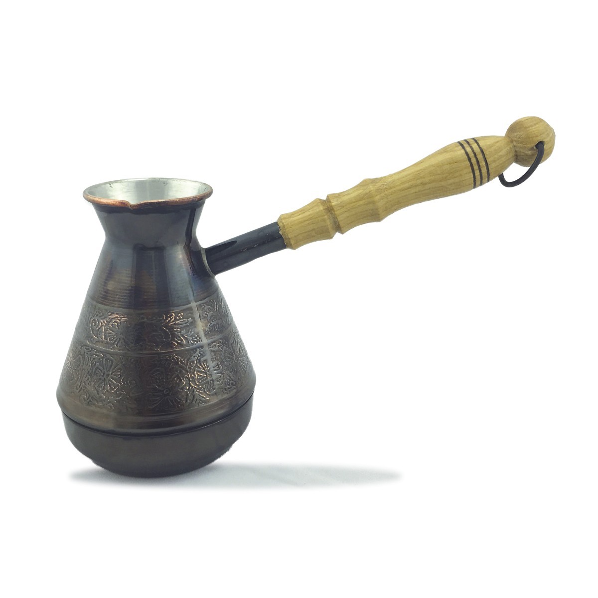 "Квітковий орнамент" - якісна турка з листової міді завтовшки 1.2 мм, виготовлена за цільнокатанною технологією. Для захисту від зовнішніх впливів, внутрішні стінки та дно турки покриті харчовим оловом, завтовшки 9-12 мкм. Зовнішні стіни покриті жароміцним лаком і мають натуральний мідний блиск.