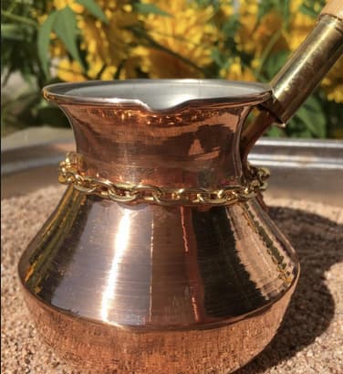Чеканка, толщина меди 1мм, внутри покрыта пищевым оловом толщиной 9-12мкм, внешне покрыта термостойким никелем. Медь обладает равномерной теплопроводностью, а сама турка имеет самое узкое горлышко, что для приготовления кофе немаловажно. Медная турка имеет специальное внутреннее покрытие из пищевого олова. Медные турки лучше подчеркивают вкус и аромат кофе, а также позволяют распределить тепло равномерно по всей поверхности сосуда, избавив кофе от подгорелого привкуса.