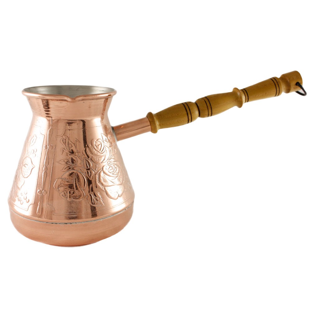 "Розы любви" - качественная турка из листовой меди толщиной 1.2 мм, изготовленная по цельнокатанной технологии. Для защиты от внешних воздействий, внутренние стенки и дно турки покрыты пищевым оловом, толщиной 9-12 мкм. Внешние стенки покрыты жаропрочным лаком и имеют натуральный медный блеск.